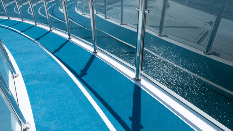 Ein modernes und anspruchsvolles Angebot an sportlichen Aktivitäten ist wesentlicher Bestandteil der TUI Cruises Philosophie. Neben der Joggingstrecke unterstreicht auch die von 3deluxe gestaltete ‚Arena‘ diesen Anspruch. Die große überdachte Halle bietet zahlreiche Sportmöglichkeiten von Kletterwand über Indoor Cycling und TRX-Ganzkörper-Workout und ist zusätzlich als Veranstaltungsfläche nutzbar.