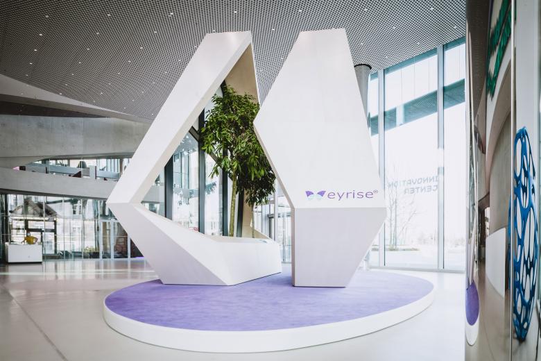 Zum Produkt Launch der innovativen Flüssigkristall Gläser der Marke Eyrise® wurde 3deluxe beauftragt, im Innovation Center der Firma Merck in Darmstadt eine Raumstruktur zu entwickeln, die die Vorteile der gesamten Produktfamilie inszeniert.