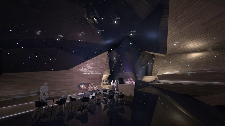 Der holzverkleidete Innenraum des Observatoriums strahlt eine natürliche und ruhige Atmosphäre aus. Insbesondere abends entsteht der Eindruck, im Freien zu sitzen: Die dunkel gefärbte Decke wird mit unzähligen Lichtpunkten illuminiert und verbindet sich mit der großen Glasscheibe zu einem raumüberspannenden Himmelsfenster. Bei einem Besuch des Mleiha Meteorite werden Natur und Architektur als Teile eines stimmigen Ganzen erfahren, die sich in ihrer Wirkung gegenseitig potenzieren.