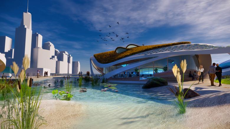 Diese Architekturstudie von 3deluxe im Auftrag der in New York ansässigen Organisation WeThePlanet versucht, neue zukunftsweisende Möglichkeiten in menschenfreundlicher und naturnaher Architektur auszuloten. Der WTP Campus dient als kommunikative Plattform des WeThePlanet Netzwerkes und wird die Möglichkeit bieten, internationale Summits, Workshops und edukative Programme anzubieten, die sich mit dem Schutz des Planeten, Schutz des Lebens, den Themen Klimawandel, sozialer Gerechtigkeit und Gleichberechtigung befassen. Der schwimmende Gebäudekomplex soll inspirierendes Vorbild für zukünftiges Leben, Wohnen und Arbeiten sein.