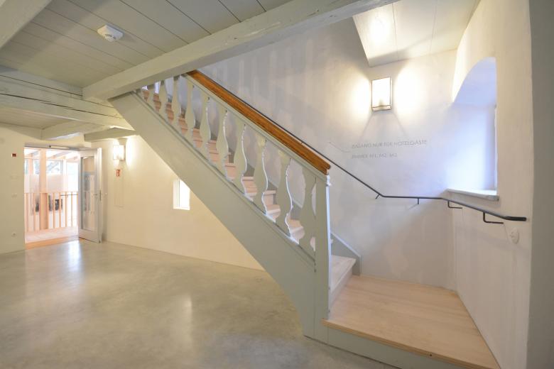 Die neuen Hotelzimmer im OG sind durch die restaurierten Dielenböden geprägt.