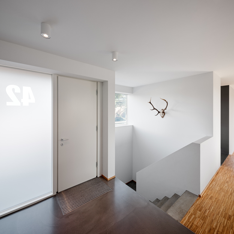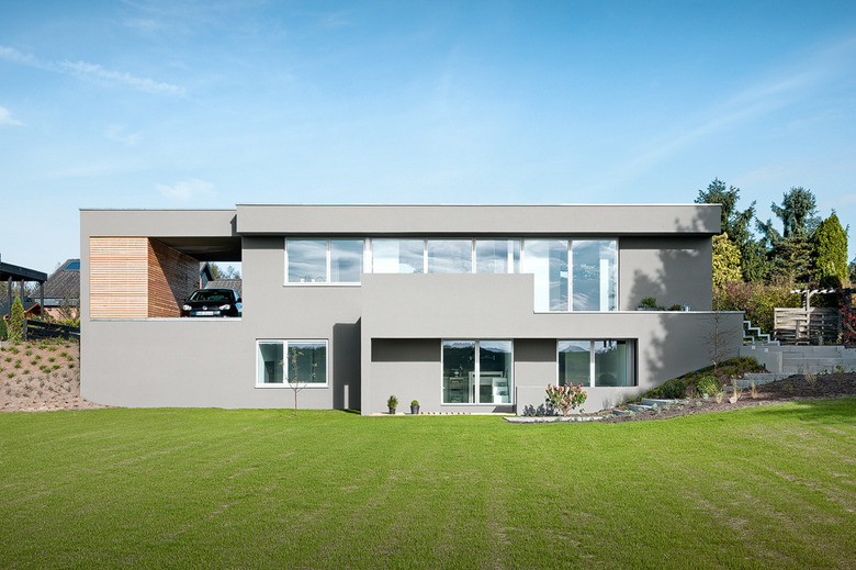 Das durch Teilung entstandene Grundstück bietet Platz für ein kleines Haus am Hang. Der Neubau fügt sich ein in die Zeile der vorhandenen eingeschossigen Bebauung, die den Rand des Ortes Heiligendorf einfasst. Der traditionelle Wohngrundriss ist hier auf den Kopf gestellt: das oberste Geschoss mit Eingang, Wohn- und Essräumen öffnet sich mit Weitblick von der großen Terrasse oberhalb des Gartens. Die Schlafräume und Kinderzimmer befinden sich im Geschoss darunter. So entsteht eine Spielloggia mit einem ebenerdigen Zugang in den Garten. Auch der überdachte PKW Stellplatz genießt den Ausblick in die Auenlandschaft.