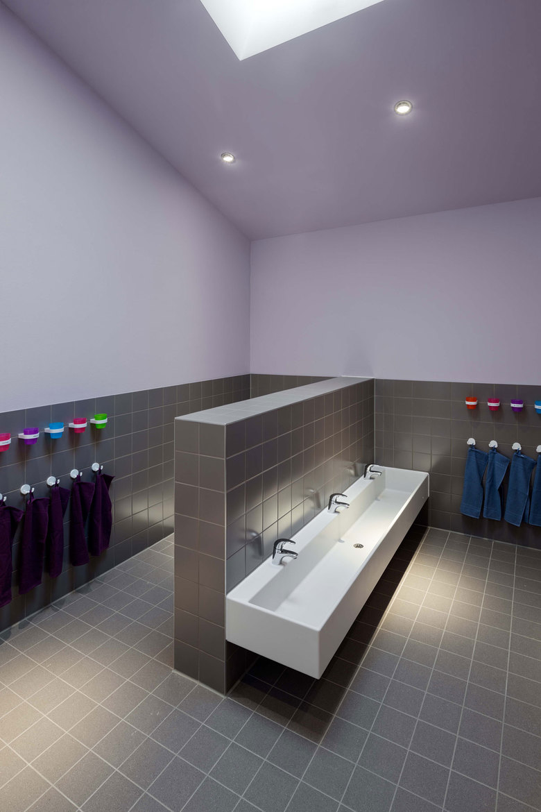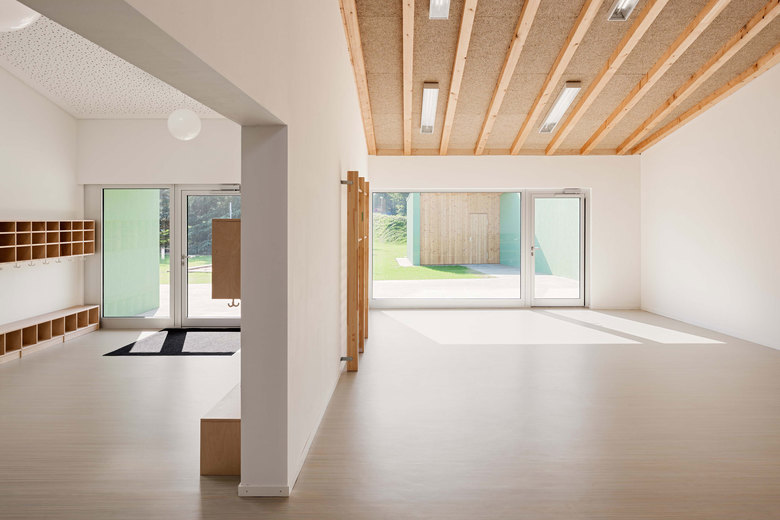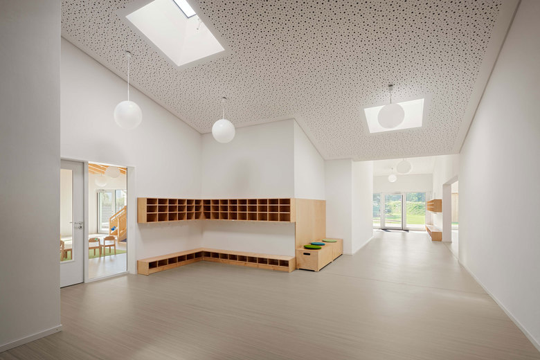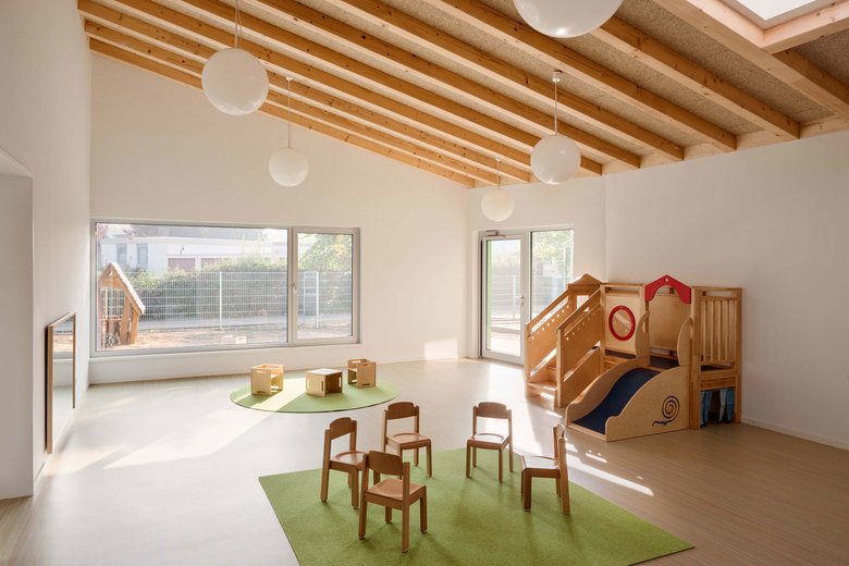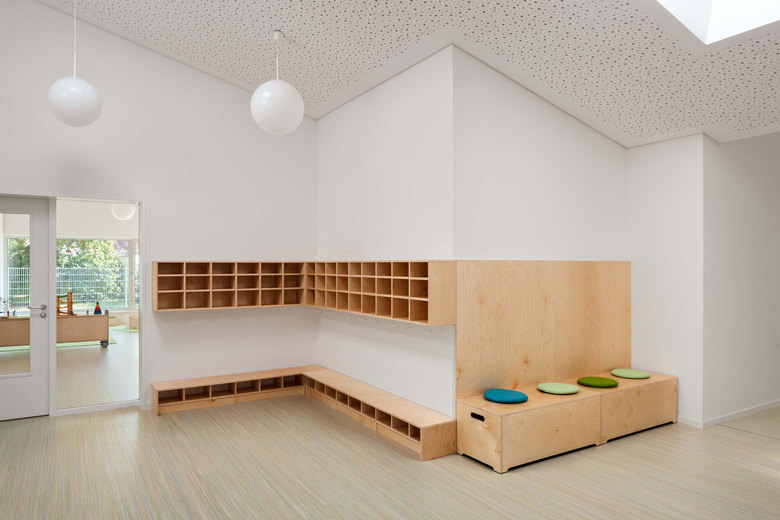Der helle, geräumige Flur mit Aufweitungen als Eingangsbereich zu den einzelnen Gruppenräumen durchzieht das Gebäude in seiner gesamten Länge vom Haupteingang bis zum Gartenausgang. Auf der Straßenseite gliedern sich die dienenden Räume wie Büro, Hauswirtschaftsraum, Technik, Küche etc an. Nach Osten-Südosten orientiert befinden sich die einzelnen Gruppenbereiche jeweils mit dem großen Gruppenraum, Wasch- und Wickelraum, Materiallager, Schlaf- oder Kleingruppenraum. Alle Aufenthaltsräume für Kinder werden über große Fensterflächen natürlich belichtet. Durch Fenstertüren entsteht ein Übergang ins Freie und auch die kleinsten Kinder haben eine freie Sicht nach Draußen.