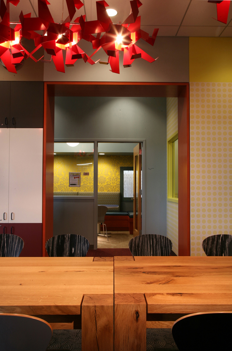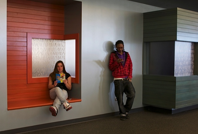 A relevant, energized 3500 SF space was transformed into a microcosm of an adult library with a diversity of resources, increased book collection and an environment that suits study and social habits of young adult users. Designed with a teen advisory board, Asian influences, clever materials, reconfigurable informal and formal furnishings and surprising elements entice and meet young adult needs. Not pristine, the Vortex teen library is designed to be casual, considered and carefully crafted.