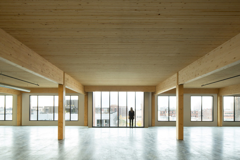 T3, which stands for "Timber, Technology, Transit," offers 224,000 square feet of office and retail space. Over 3,600 cubic meters of exposed mass timber columns, beams, and floor slabs recall the heavy timber construction of the building’s predecessors. T3’s modern technological approach uses engineered wood components (chiefly glulam and nail laminated timber) for the roof, floors, columns and beams, and furniture. A significant amount of the lumber used to fabricate the NLT comes from trees killed by the mountain pine beetle. These modern materials bring the warmth and beauty of wood to the interior, and promote a healthy indoor environment for occupants.