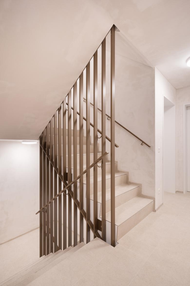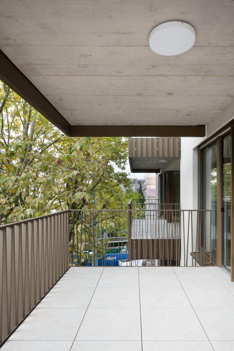 Die Erschliessung erfolgt über die Strassenseite; Treppenhaus und Lift liegen im Kern und ermöglichen eine klare Organisation der Wohnungen. Im Erd- und Sockelgeschoss liegen drei Maisonettewohnungen mit direkten Gartenzugängen. Darüber befinden sich Geschosswohnungen mit hofseitigen Balkonen, während die beiden Maisonette-Attikawohnungen grosszügige Dachterrassen mit Ausblicken in mehrere Richtungen schaffen. Drei Kleinwohnungen orientieren sich ausschliesslich zur Strasse und sind durch integrierte Loggien Teil des Fassadenbildes.