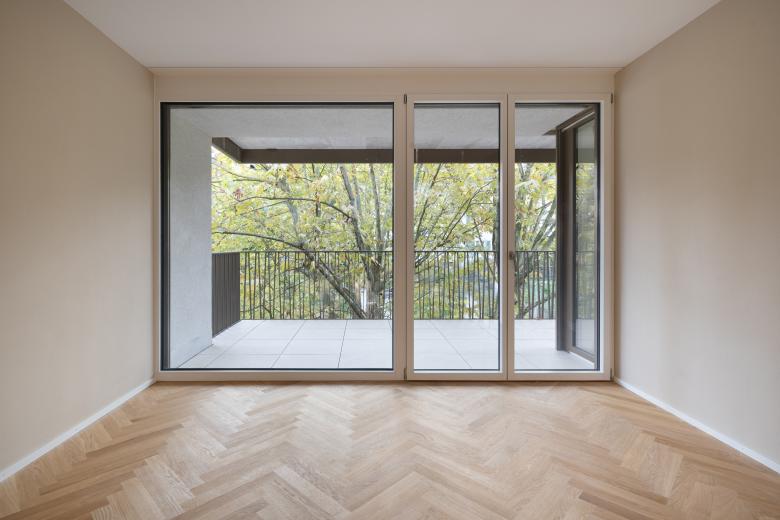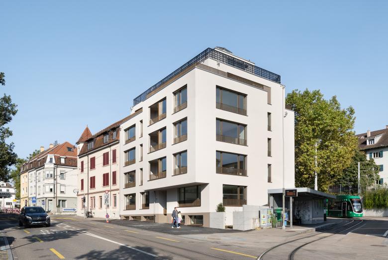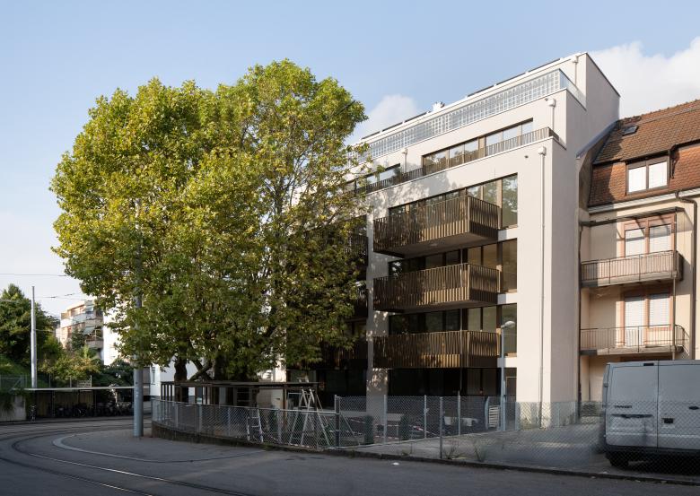 An der Lörracherstrasse 162 entstand ein Neubau mit 14 Eigentumswohnungen. Das Gebäude folgt der Strassenlinie und kreiert auf der Hofseite einen geschützten Garten mit altem Baumbestand. Die Grundrisse sind ost-west bzw. süd-ost-west orientiert, wodurch die Wohnungen von zwei bis drei Seiten natürlich belichtet und belüftet werden.
