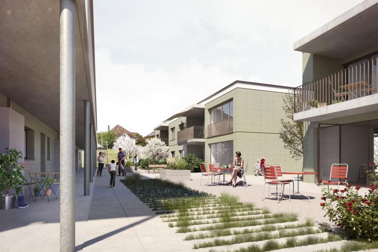 Neben den individuellen 2.5 und 3.5 Zimmer Wohnungen soll die Siedlung das gemeinschaftliche, aktive Zusammenleben fördern und ermöglichen. Durch gemeinschaftliche Begegnungsmöglichkeiten in den Innen- sowie Aussenräumen und einer starken Beziehung zur Natur, entsteht eine ländliche Urbanität mit hoher Wohnqualität.