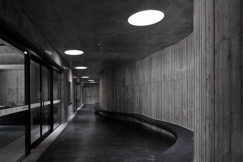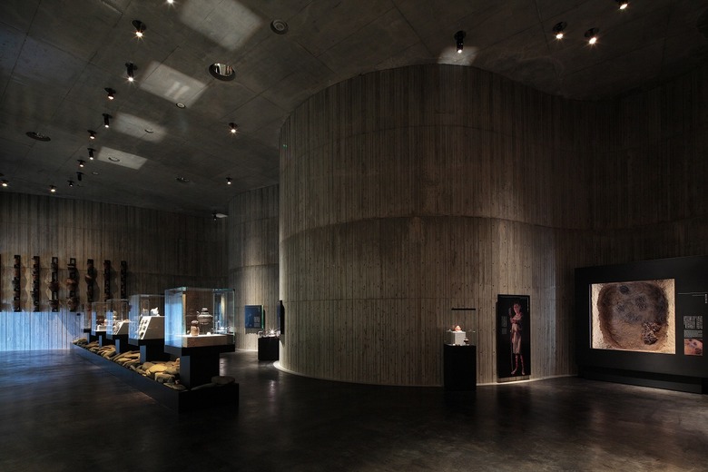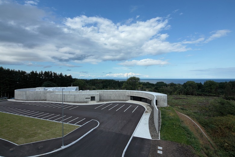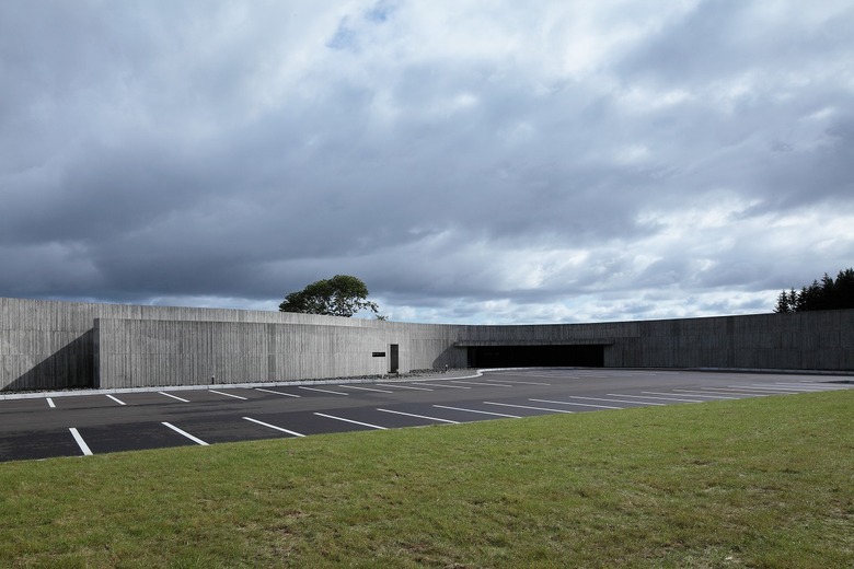 旧南茅部町「垣ノ島遺跡」の一角を敷地とした、国宝「中空土偶」を展示する博物館に小規模の「道の駅」を併設している。縄文文化を生み出した細やかな手の痕跡、緩やかな曲線、質朴な素材と原理的な表現などを手がかりに空間を組み立てた。建築は大きな曲率をもつ壁を基線とし、現代(バイパス)と縄文時代(垣ノ島遺跡)を分ける結界をつくりその遺跡側に主要な機能を配している。曲面壁はコンクリート打放しとし、厚みと巾をランダムに変えた道南杉の小幅板を600mm巾の普通型枠に貼り付けることで、滑らかな曲面を経済的に構築した。