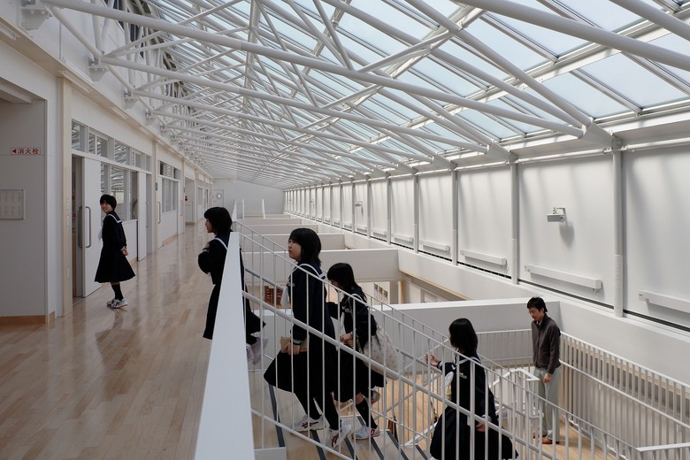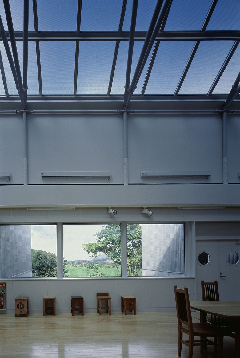 RC2階建て既存校舎の大規模改修を通してサスティナブルな建築の在り方を模索した。既存建物の中央部を一部解体することで減築による耐震性能を高め、併せてガラス屋根による自然採光・自然通風を導入して消費エネルギー削減を果たした。シンボリックな2層吹き抜け空間から子供の活動の場に光が満ち溢れる。