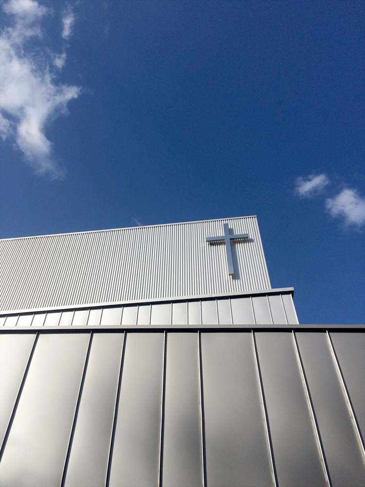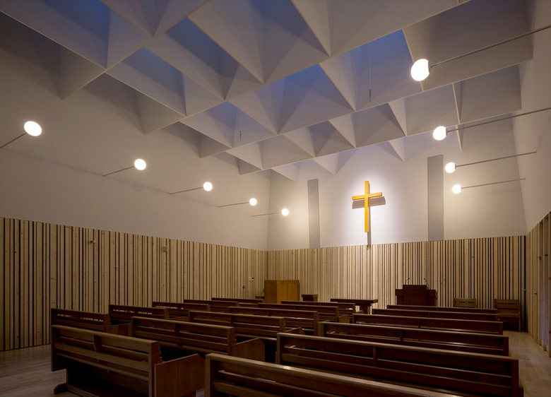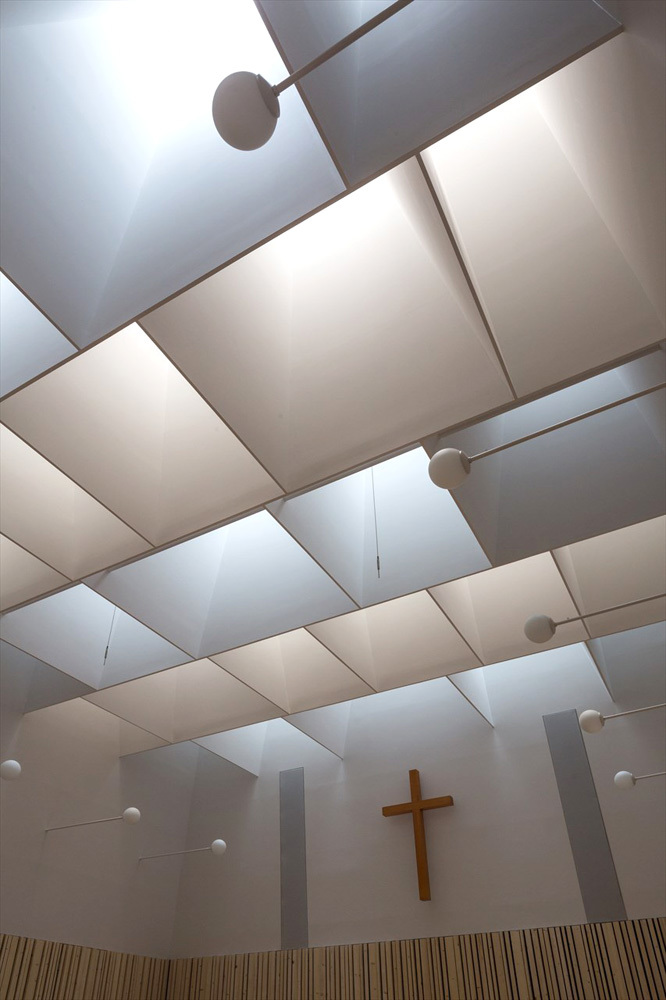 礼拝堂を中心に教会活動を支える諸室で囲み、人々を迎える大きな軒下とともに、外部とのつながりを意識した開かれた教会を目指した。中心に据えられた礼拝堂には東西両面に面するトップライトを複数設け、その下には様々な角度を持った深さ4mの光井戸と称する天井を持ち、反射光と直射光の違いや一年一日の光の変化を増幅して礼拝堂に届ける。光井戸の深さと様々な角度は、音響、熱環境にも良い効果をもたらし、教会の存在を印象付ける三角形の連続屋根を形作っている。