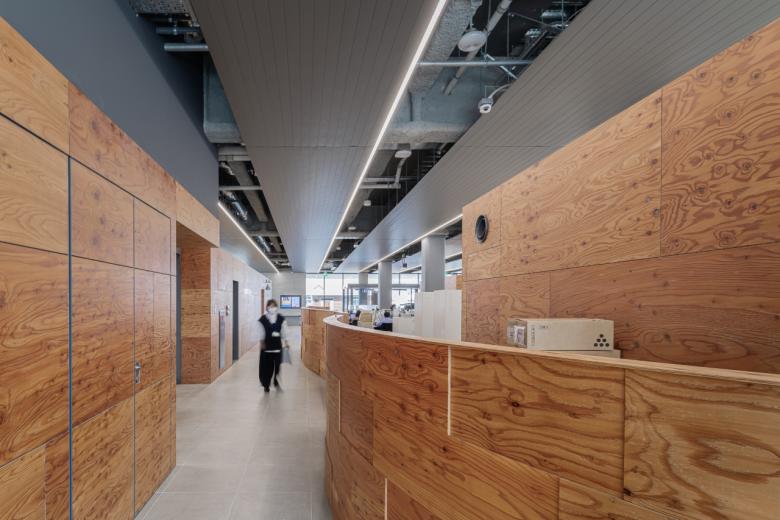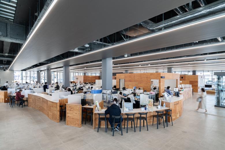 正方形プランの中央に執務室を配置し、その周囲を回遊できる動線計画とした。執務室は課長席を設けないユニバーサルレイアウトを採用することで、無駄なスペースを省き効率化を図った。外周部が自然光や温度を吸収し、執務室の安定した温熱環境とムラのない光環境を獲得した。