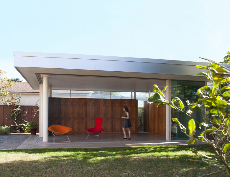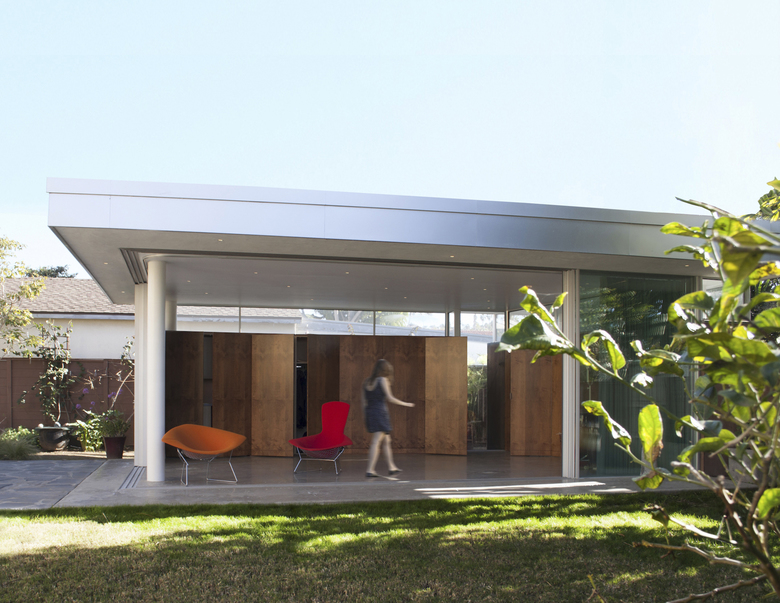 This pavilion is designed as an independent structure and was conceived to be a place for entertainment and relaxation. It is open completely on two sides and closed on the opposite sides by two boxy volumes, containing support functions. The sliding doors open fully to the garden for special events, allowing the outside space to merge with the interior. On its roof, solar panels absorb the Sun’s energy and generate enough electricity for the entire household.