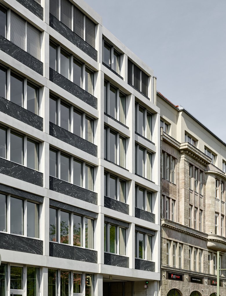 Das Erscheinungsbild des Neubaus ist geprägt vom Raster seiner Betonkonstruktion und dessen Ausfachung mit massiven Brüstungselementen aus dunkelgrauem Granit. Die Fassade auf der Hofseite basiert auf dem selben konstruktiven Prinzip, wird aber mit der Zeit von Kletterpflanzen überwachsen. Das aus Beton und Holz konstruierte Staffelgeschoss bietet einen offenen, stützenfreien Innenraum mit Terrassen zu beiden Seiten und weite Ausblicke über die Dächer der Stadt.