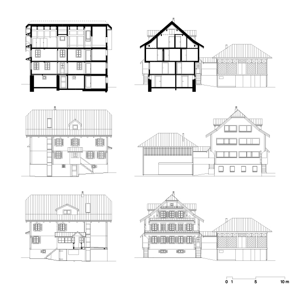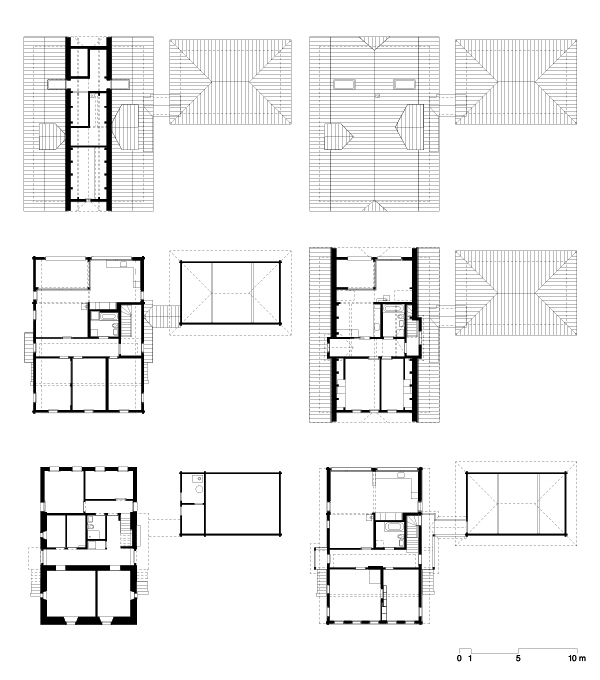 1835 wurde das Ensemble nach einem Brand wieder aufgebaut. Die jüngste Erweiterung würdigt diesen Bestand und ordnet sich seinen Regeln unter. Verschiebungen in der Erscheinung, wie eine gläserne Trennung zwischen Alt und Neu oder die Zusammenfassung von Fenstern, machen die Eingriffe lesbar.