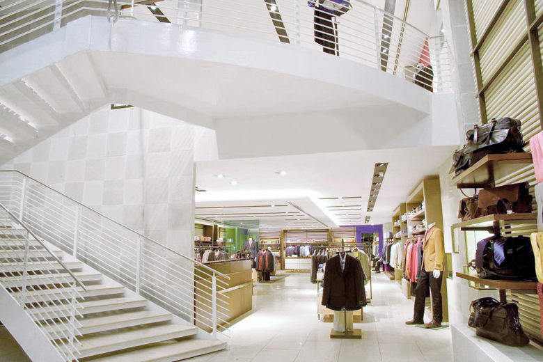 weave sporadically into cross beams. Two yellow and violet horizontal strips circle around the two-storey shop window, connecting the European love of simplicity with the Indian love of colours.