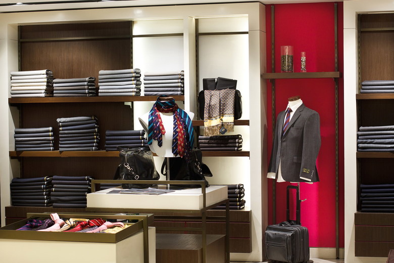Reid & Taylor unite three styles of the men’s world. The custom-made business suit is as much part of the offering as casual wear and formal suits for everyday city-life. The corresponding lifestyles, be it club, salon or games room meet their equivalent in the interior concept of the exclusive divisions. Customers are met in the generous casual area, which persuades with its simplicity and elegance. The overlay of screens, frames and presentation systems creates a multifaceted and adaptable element family, which meets the various demands on a stylish presentation of merchandise. Adjoining the casual area is the formal-wear division on the one side and the accessory area on the other. “Take Bangalore as an example,” Mrs Angela Kreutz starts to tell, “the ensemble of the freely connected style areas forms the reception hall of the store – an inviting gesture full of light and openness.” An architectural eye-catcher: The curved flight of stairs leading to the gallery on the upper floor, where the offering of the exclusive tailoring department behind is presented. Noble craftsmanship is virtually celebrated there, for instance by the central tailor’s table, which imparts directly the feeling for the tailor’s handcraft. A fireplace functions as a very special room divider that raises the association with the world of a gentleman’s club.
