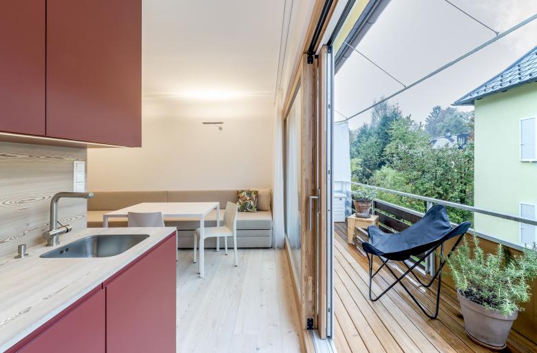Nur 25 m² klein, aber mitten in Salzburg. Hier genießen ein Ehepaar, ihre Kinder oder Freunde der Familie die Festspiele oder einfach ein Wochenende in der Stadt.