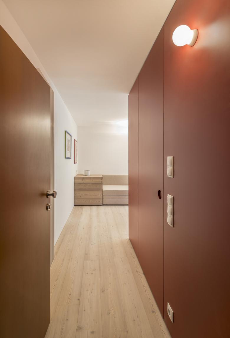 Aus dem Miniraum wurde das Maximum herausgeholt. Abstriche gibt es trotz der winzigen Ausmaße keine. Gänge übrigens auch nicht. Die Öffnung zum Balkon wurde so weit als möglich aufgebrochen. Hochwertigste Ausführung und Maßarbeit sind Grundvoraussetzung. Die Kosten pro Quadratmeter sind sehr hoch. Gefühlt ist dafür die doppelte Fläche entstanden.