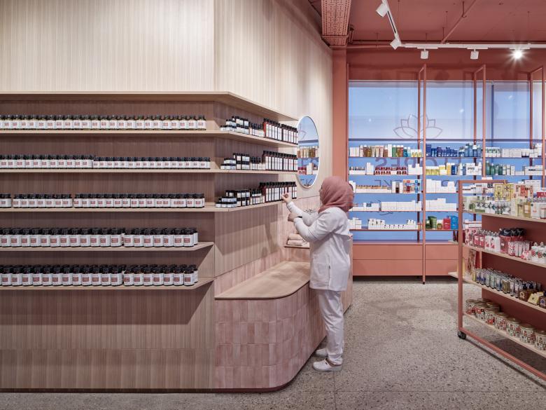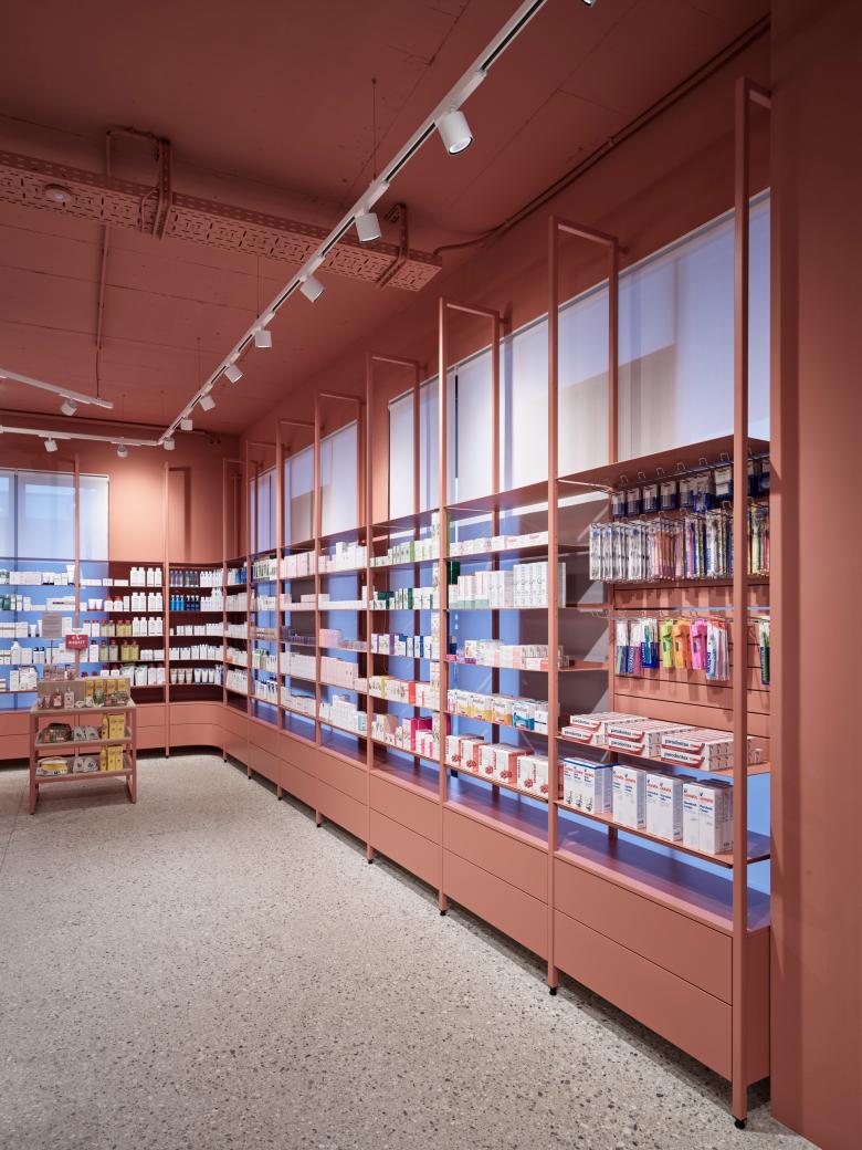 Drei monolithische, ebenfalls in Rosa geflieste Doppel-Tara-Plätze geben den Blick auf die großzügige Sichtwahl frei. Dahinter liegen der Lagerautomat und das Back-Office. Kurze und schnelle Wege auch hier. Im architektonischen Seitenstrang finden der diskrete Beratungsraum, das Chefbüro und das Labor Platz. Von dort gelangt man ins Handlager, den Raum für Mitarbeiter:innen und ins Nachtdienstzimmer.