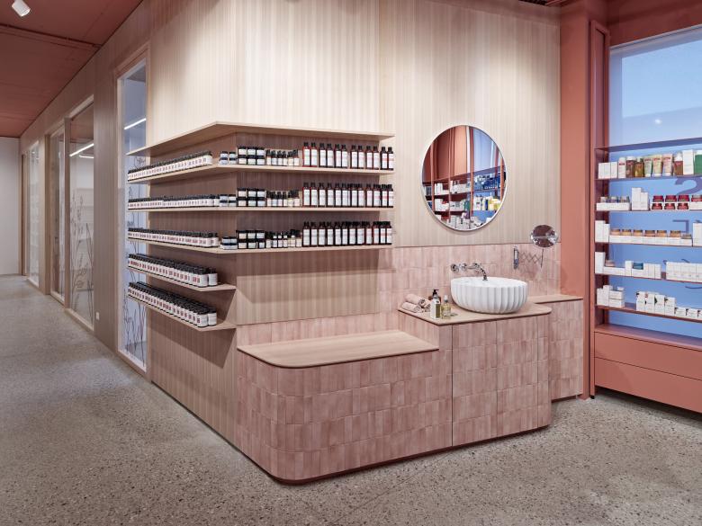 Durch die Monotonie der Farbe, die sich bis hinauf unter die Decke zieht, nimmt sich die Möblierung aus filigranen Stahlrahmen zurück und stellt die Ware in den Vordergrund. Ein innovativer Ansatz im oft durch schwere Möbel dominierten Apotheken- und Ladenbau. Der seitliche Kosmetikbereich inspiriert zum Ausprobieren am plätschernden Jungbrunnen. Und die Rezeptur ist optisch mit der Offizin verbunden und gewährt Einblick ins pharmazeutische Arbeiten.