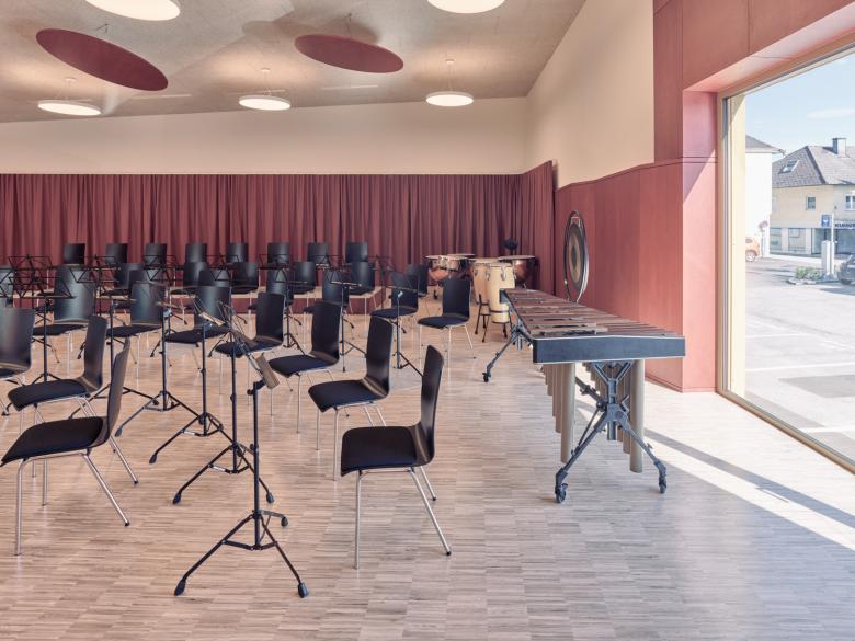 Bei der Wahl der Materialien wurde darauf geachtet, so viel wie möglich auf Natürlichkeit und Nachhaltigkeit zu setzen. Über ein Foyer gelangt man vom Saal in den Altbau, der in großen Teilen entflechtet und neu organisiert wurde. Das Erdgeschoß wurde als halb-öffentliche und multifunktionale Zone erdacht und beinhaltet neben dem Proberaum des Männergesangsvereins und diversen Räumen des Musikvereins auch das neue Stadtarchiv von Grieskirchen. Die oberen Stockwerke sind für die Nutzung durch die Landesmusikschule bestimmt.