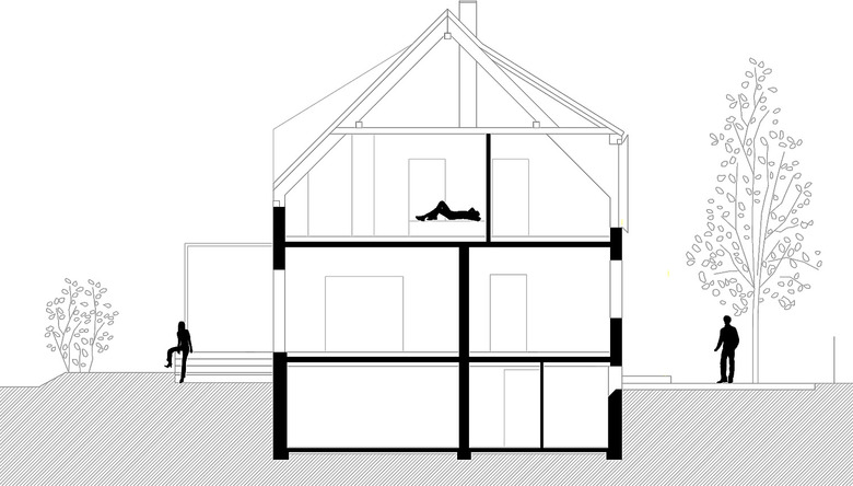Mit seinem Satteldach bleibt der Baukörper der traditionellen Bauweise der 60er Jahr treu, führt die Form aber auf ihre schlichteste, von allem Dekor befreite Erscheinung, zurück. Reizvoll ist besonders, dass die bestehende Struktur des Hauses weitgehend belassen wurde und so der Charme der 60er Jahre ablesbar bleibt.