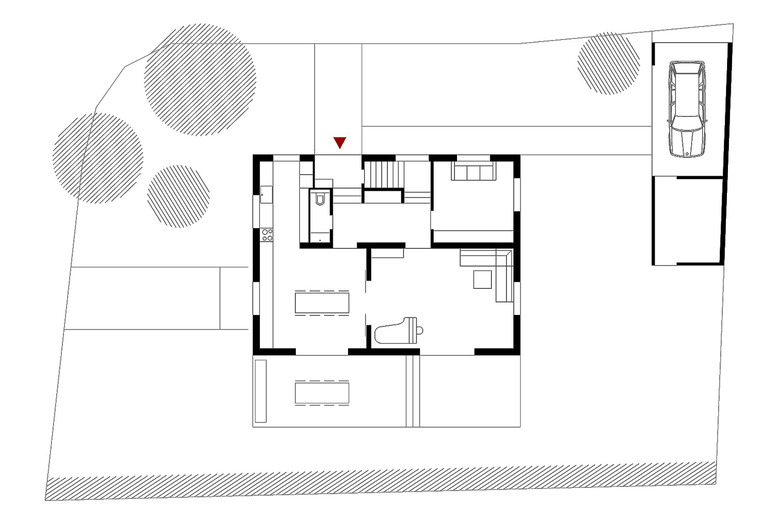 Das kleinvolumige Haus besitzt, trotz gering bebauter Fläche eine überraschend hohe Anzahl an Räumen und kann so den Anforderungen der 5-köpfigen Familie gerecht werden. Das Erdgeschoß, welches den Wohn- Ess- und Kochbereich sowie ein kleines Arbeitszimmer aufnimmt, bleibt in seiner Raumstruktur annähernd unverändert. Lediglich die Eingangszone mit Garderobe und kleiner Sanitärzelle sowie die Küche wurden adaptiert. Im Obergeschoss erfolgte zur Gänze eine Neuorganisation. Im Zuge der Erneuerung des Dachstuhls wurden großzügige Schleppgauben eingefügt, welche für eine ausreichende Belichtung der Kinderzimmer sorgen und dem Gebäude dessen besonderen Charakter verleihen.