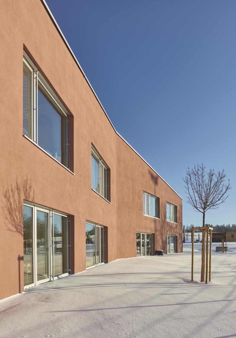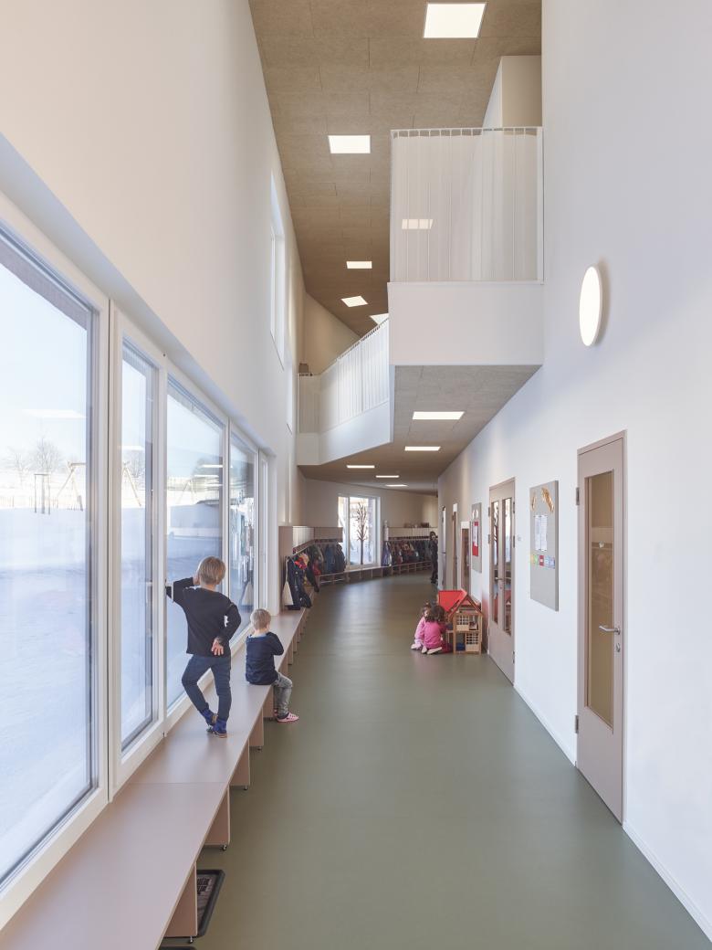 Die Gliederung in zwei Baukörper nimmt einerseits Bezug auf den Maßstab der Umgebung und entspricht andererseits den pädagogischen Anforderungen. Kindergarten und Krabbelstube sind in zwei Häuser getrennt. Dort wo es sinnvoll ist, treffen Krabbler und Kindergartenkinder aufeinander: beim Haupteingang und im Essensbereich. Das entspricht nicht nur den Bedürfnissen der Kinder, sondern schafft auch maßgeschneiderte Räume mit viel Licht und unmittelbarem Außenbezug sowie Zwischenräume und klar abgegrenzte Eingangsbereiche. Ein unabhängiger Betrieb mit guten Schnittmengen ist so garantiert.