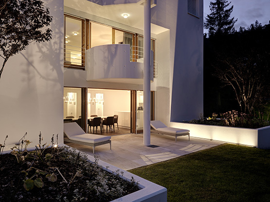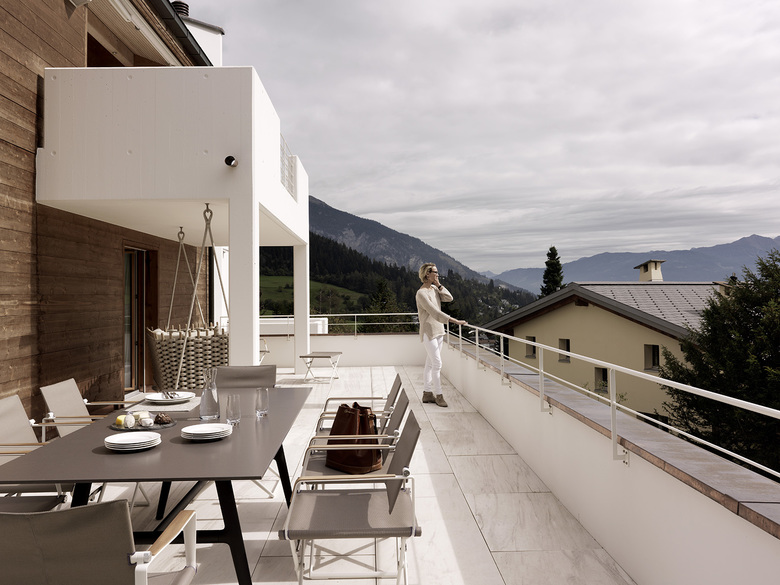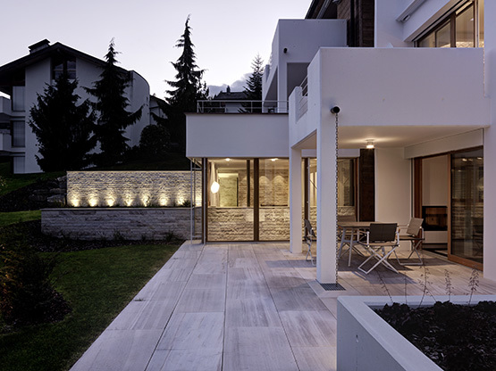 Die Neuaufteilung des Gartens mit einer grosszügigen Sonnenterrasse verbindet diese Wohnungen mit dem früher erstellten Gemeinschaftsbereich. Die Familie möchte den Sitz in den Bergen vermehrt im Sommer nutzen.