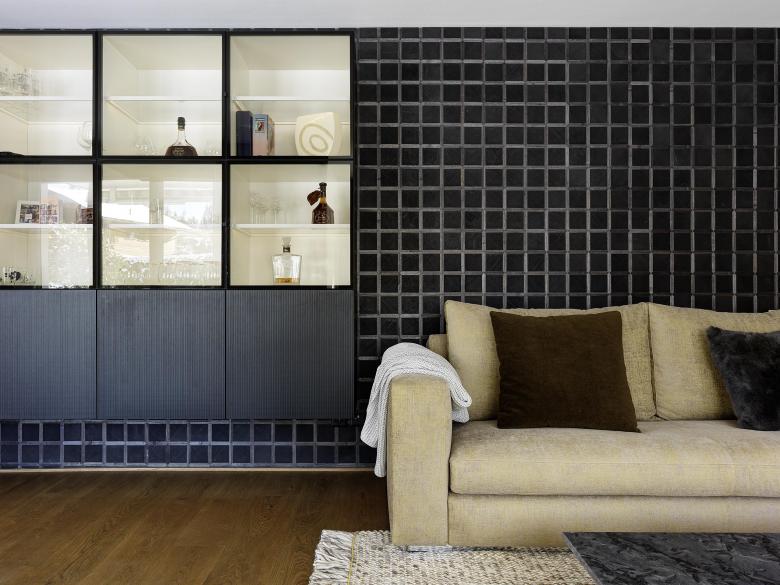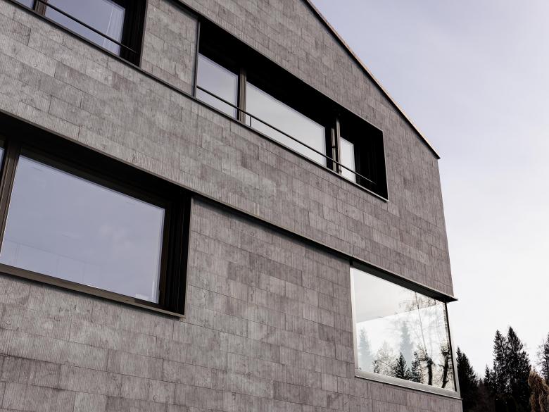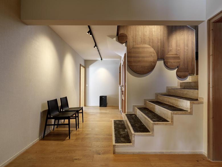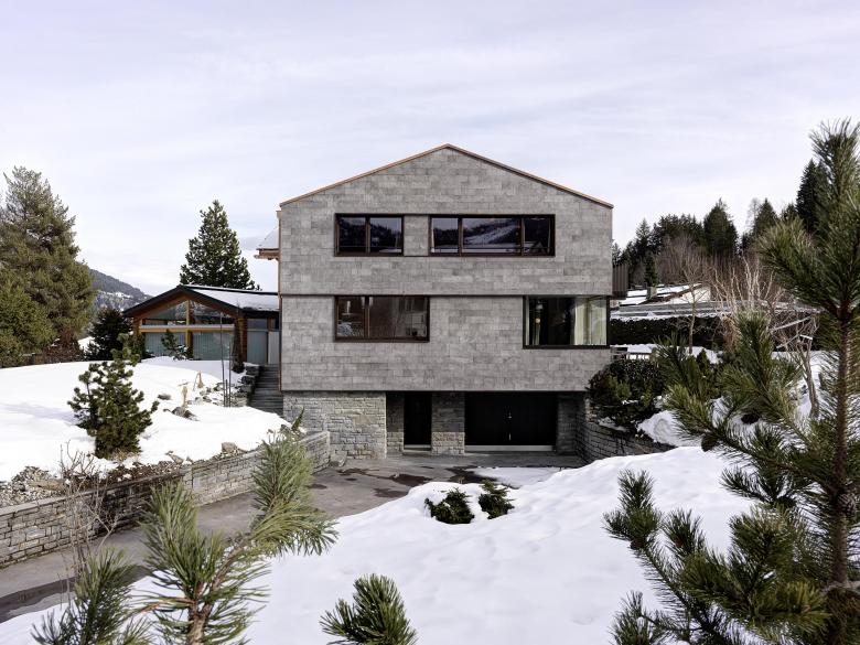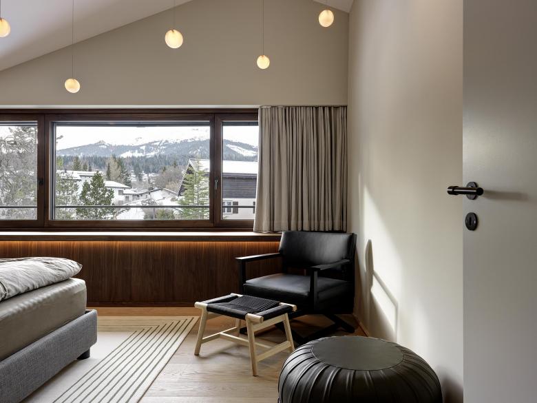 Die neue Besitzerfamilie wünschte sich den freien Blick in die Bergwelt – und dies aus einem neuen Elternschlafzimmer mit Ankleide im Dachstuhl. Es wurde mehr daraus. Das langgezogene Steinplattendach wurde im Rahmen der Aufstockung aufgerissen und ein Quernau eingepasst, der zwei neue Schlafzimmer mit Bergsicht beherbergt. Die Übernahme des bestehenden Eckfensters in die neue Fassadengestaltung erforderte auch, die Fenster in der bestehenden Küche grundlegend zu verändern und in die neue Hauptfassade über der Einfahrt zu integrieren. Die neuen Räume wurden mit hochwertigen Materialien detailliert ausgearbeitet und durch ein witziges und qualitativ hochwertiges Lichtkonzept ergänzt.