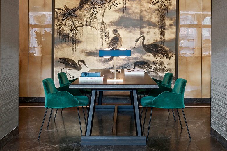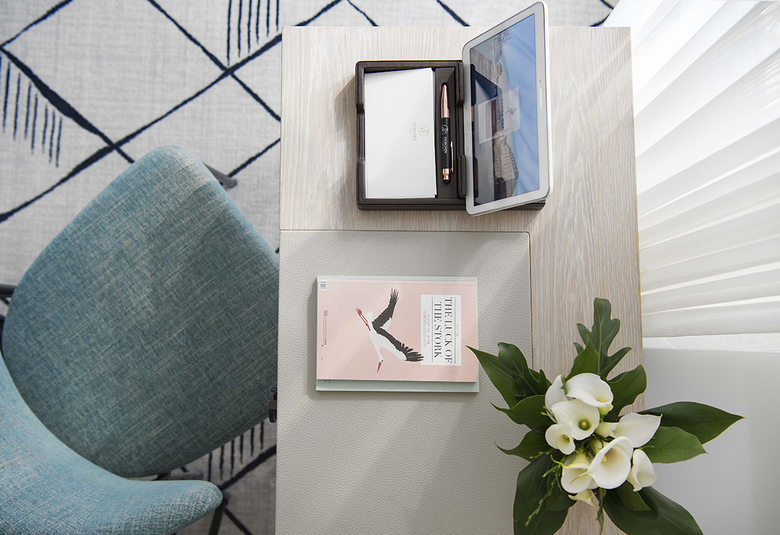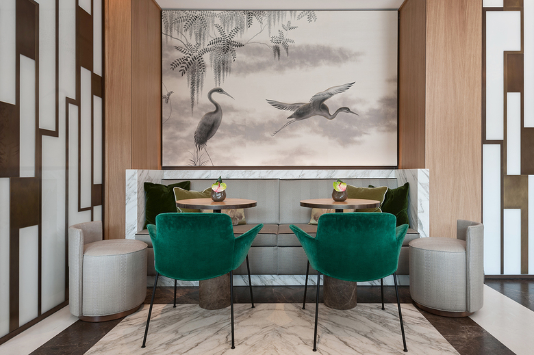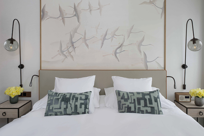 Ein wichtiges Designelement im gesamten Haus sind die handbemalten de Gournay Tapeten, die für jedes Zimmer individuell angefertigt wurden. Storchenmotive, Trauerweide und Glyzinien unterstützen den Charakter der neuen, in drei Farbvariationen ausgestatteten Zimmern. Auch in den öffentlichen Bereichen werden die handgefertigten Tapeten mit Storchenmotiven ein prägendes Element des neuen Storchens darstellen. Alles Motive, die um den Zürichsee zu finden sind und durch den weltweit bekannten Hersteller de Gournay neu interpretiert wurden.