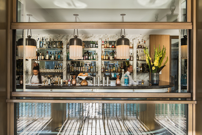 Im Erdgeschoss wird die denkmalgeschützte Glasfassade durch den neuen Hoteleingang neu gegliedert und anhand der Materialvorgabe der geschützten Metallfenster analog in Bronze fortgesetzt. Die Umsetzung mit modernsten Hub-Fenstern sind ein weiteres Merkmal einer sowohl historisch bewussten, als auch technisch modernen Neukonzeption des Hauses, das sich zur Stadt und zum Restaurantgast hin öffnet und dessen Lobby nicht nur für den Hotelgast frei zugänglich macht. An dieser Stelle zeigt sich dieses Bestreben, die Gastronomie auf der Strasse und dem Platz in das Gesamtprojekt einzubeziehen, am deutlichsten. Der Einbau einer neuen Boulevard Küche ist ein weiterer Beweis für die neue Ausrichtung des Storchens.