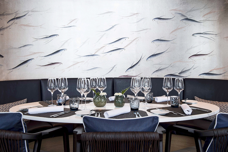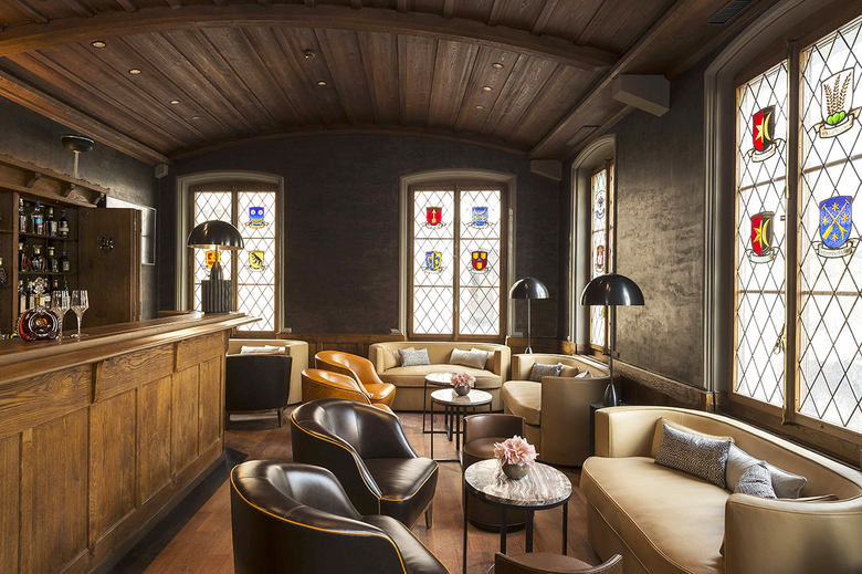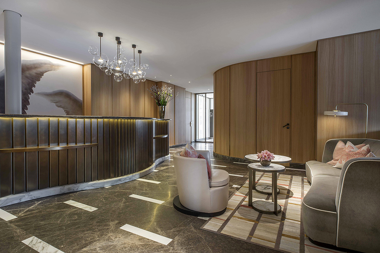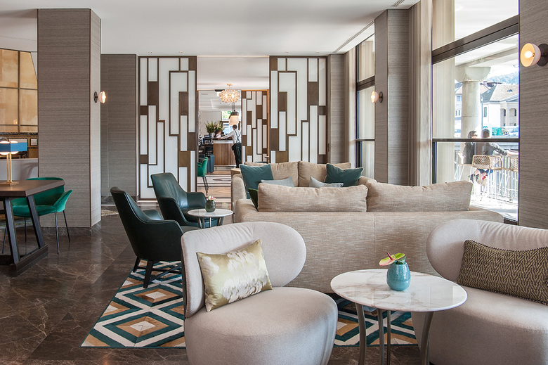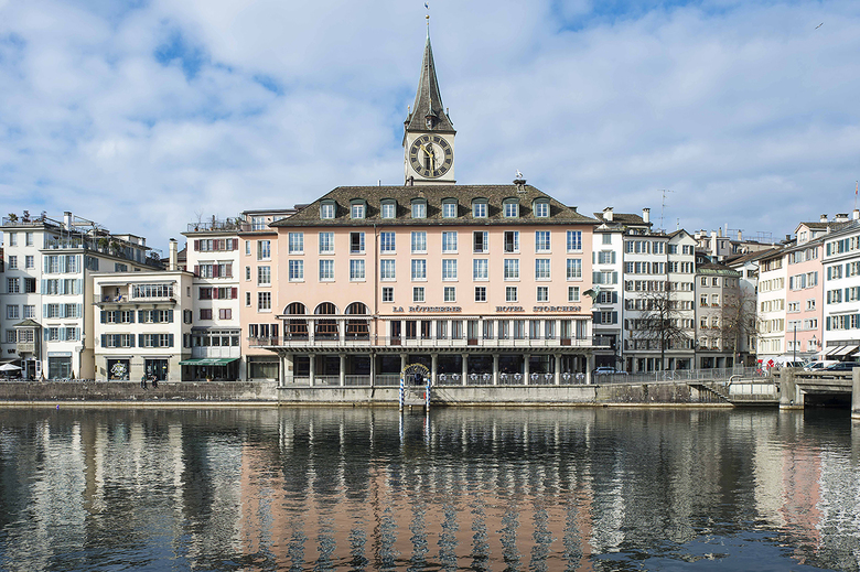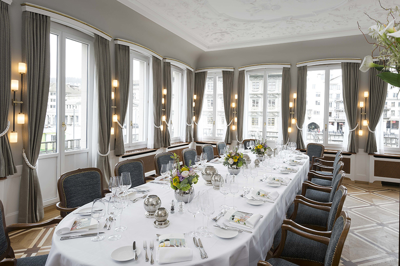 Die öffentlichen Bereiche im Erdgeschoss sind stark durch die Nähe zur Limmat geprägt. Petrolblau spielt hier in der Farbwahl der Möbelstoffe eine sehr entscheidende Rolle. Die Motive der Kunsttapeten aus dem Hause de Gournay sind im Erdgeschoss reichhaltiger und üppiger als in den oberen Geschossen. Die Wahl der Möbel ist sehr stark geprägt nach dem Wunsch, eine international reisende Kundschaft in einem wohnlichen Umfeld zu bedienen. Die Materialwahl in der neuen Barchetta widerspiegelt die neue Öffnung zur Stadt und versprüht Präzision wie Eleganz gleichermassen. Das gesamte Erdgeschoss erhält einen neuen Marmorboden, der in den Zonen der Hotelhalle, der Barchetta, der Lobby und auch dem neuen Board Room in veränderter Form zum Einsatz kommt.