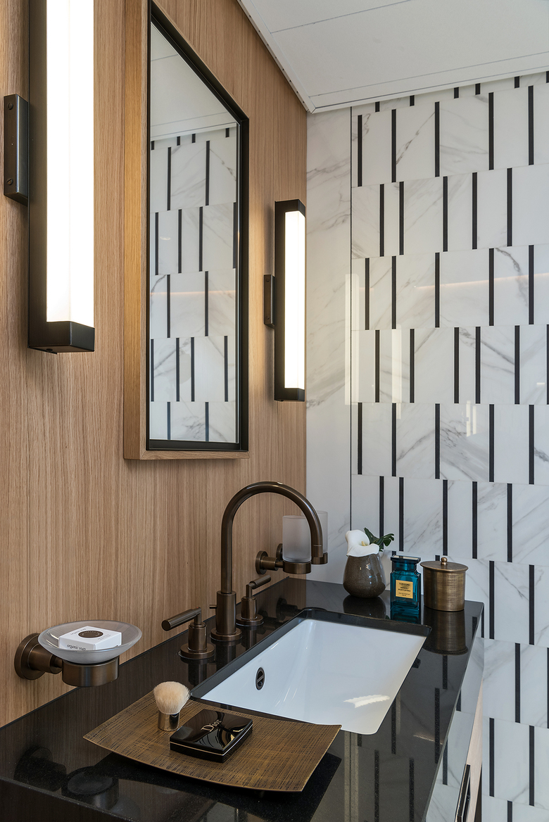 Die Klasse des Hauses wird durch raumhohe Wandpanelen aus Holz und durch die Verwendung edelster Materialien wie Marmor unterstrichen. Die Möblierung stellt eine Auswahl an Möbeln aus Italien, Deutschland und Grossbritannien dar. Massgeschneiderte Einbauten wurden durch unser Büro entworfen und durch eine im Bootsbau erfahrene Schreinerwerkstatt umgesetzt. Starke Akzente setzen beispielsweise die einmaligen dekorativen Leuchten aus den USA in der neuen Barchetta Bar im Erdgeschoss. Als Blickfang werden bestimmt auch die italienischen vintage Pergamentpanelen aus den 50er Jahren wahrgenommen, die in der komplett umgebauten, sich zur Limmat öffnenden Lobby, ein neues Zuhause gefunden haben.