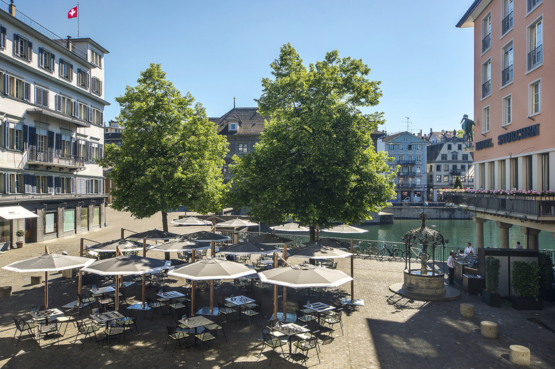 Das wichtigste Merkmal der Umbaumassnahmen im Erdgeschoss ist die neue Ausrichtung des Hauses zur Stadt, die sich einerseits in einem neuen Zugang von der Limmat her und andererseits in der Überarbeitung des Boulevard Cafés mit der neuen Barchetta manifestiert.