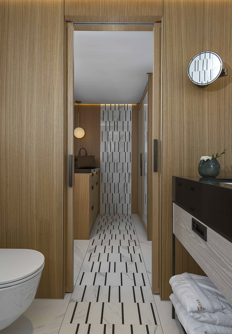 Die Idee, das Hotelzimmer als „Storchennest“ zu verstehen, bestimmte die Wahl der Materialien und Farben in direkter und intensiver Rücksprache mit der Eigentümerschaft. Beispielsweise ist das Teppichdesign und das Marmormosaik in den Zimmern eine lyrische Interpretation des Storchenfederkleides. Schwarz weisse Marmorstreifen bekleiden den Boden und die Wände im Eingangsbereich und im Bad. Die Teppiche erhielten einen abstrakten „Fussabdruck“ des Storchens und stellen nun ein zeitgenössisches, abstraktes Muster dar.