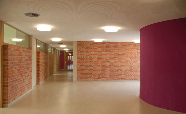 Die Bauzeit von sechzehn Monaten war äußerst knapp bemessen. Aus dieser Vorgabe ergab sich ein ebenso für die Konstruktion wie für die Gestaltung relevanter Aspekt: weite Teile des Tragwerks bestehen aus vorgefertigten Komponenten aus Beton oder Holz, die im weiteren Ausbau sichtbar belassen blieben. Eine wichtige, auch architektonische Absicht war die größtmögliche Robustheit aller Details und Oberflächen, die im Alltag der Nutzung Patina zulassen - ohne Einbußen für die Gestaltung. Dieser Robustheit entsprechend und dem Anspruch, die Materialien in ihrer „Natürlichkeit" zu zeigen folgend, sind die Fassaden zum öffentlichen Raum hin mit Sichtmauerwerk bekleidet, die zur offenen Landschaft hin mit einer senkrechten Holzschalung.