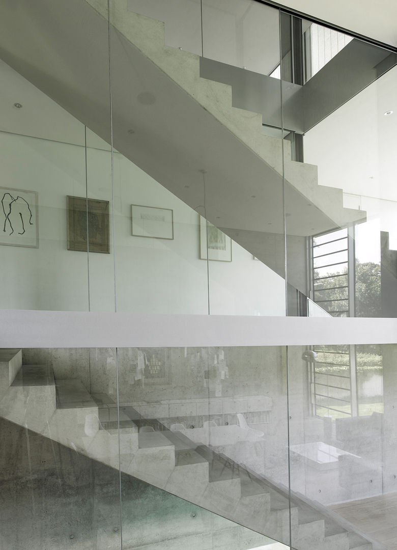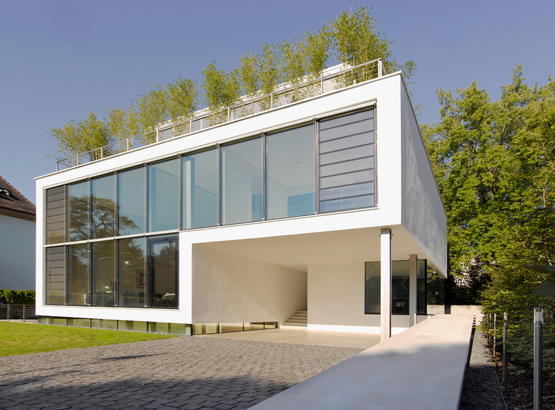 Um eine optimale Belichtung des fast gänzlich im Erdreich liegenden Untergeschosses zu erreichen, schwebt das Eingangsniveau 1 Meter über dem natürlich gewachsenen Gelände, wodurch ein umlaufendes 50 cm hohes Fensterband entsteht. Durch dieses Fensterband und durch die Schrägstellung der Hofwand des vorgelagerten Lichthofs wird das Licht optimal in das Innere des Untergeschosses geleitet.