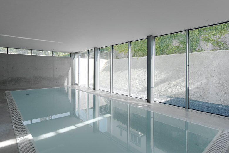 Untergeschoss: Schwimmhalle mit vorgelagertem Lichthof, Gästezimmer, Bad, Waschküche und Haustechnikraum.