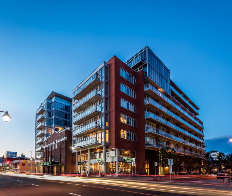 The aim of the project was to (i) redevelop the surface parking lots that occupied much of the sites, re-stitching the urban fabric in this important location between downtown and the Glebe; (ii) bring new retail and a significant number of new residents to this central location, supporting the city’s urban intensification efforts while offering affordable, high-design living options; and (iii) develop a series of clean, modern design yet contextual buildings that reinterpret the heritage streetscape in a way that is both contemporary and respectful.