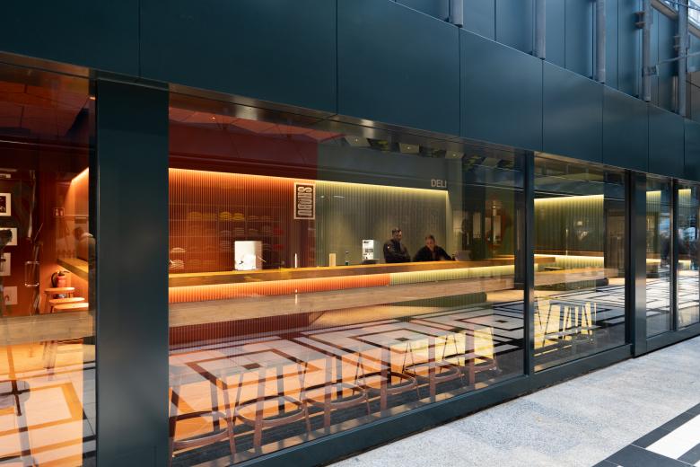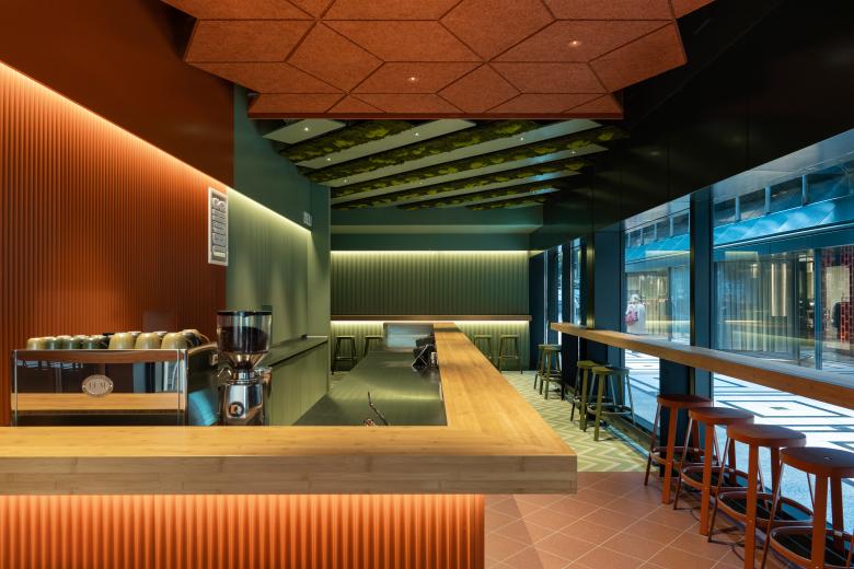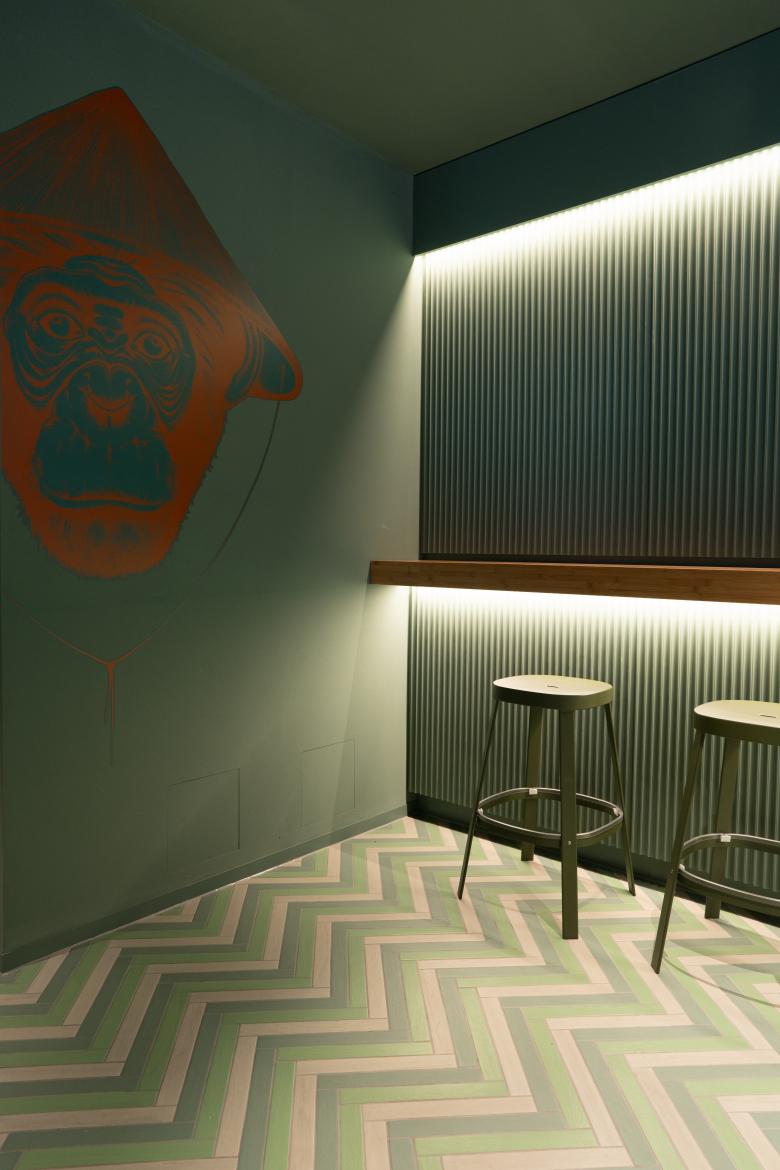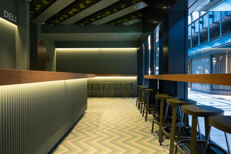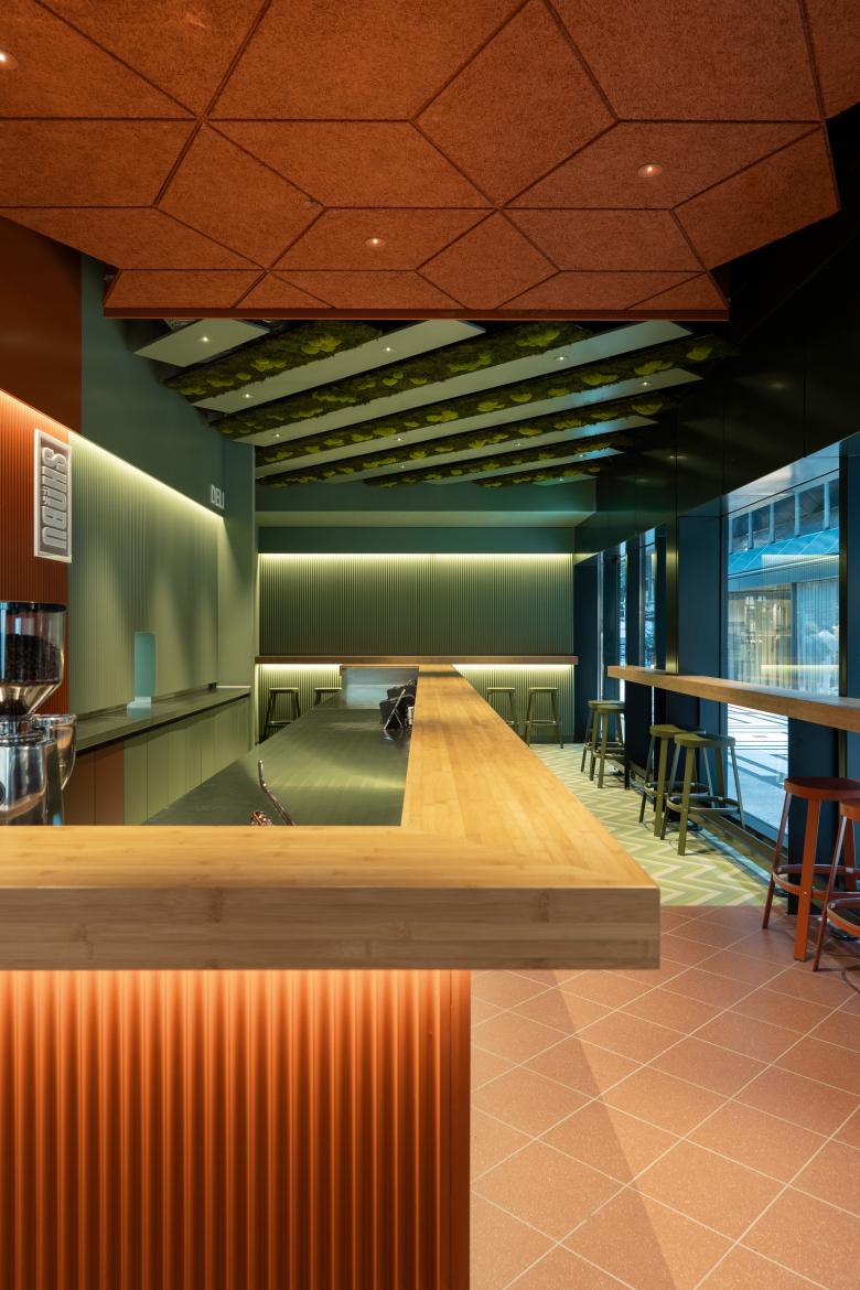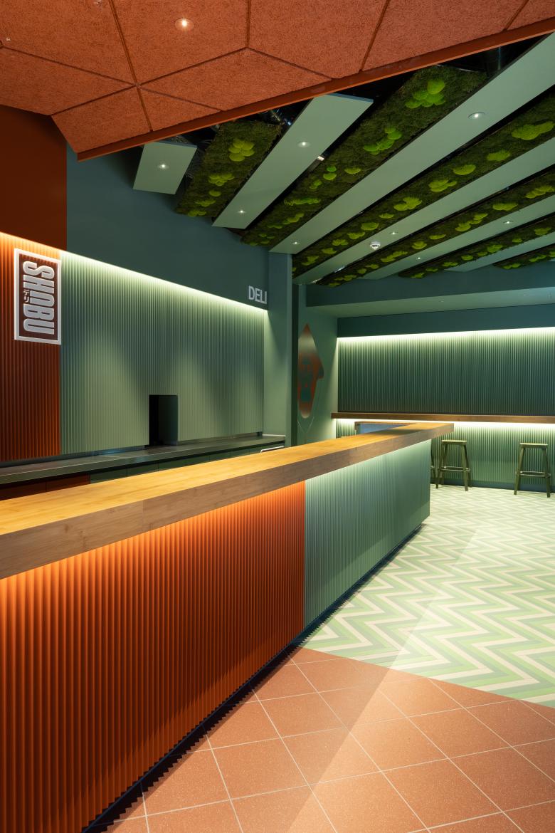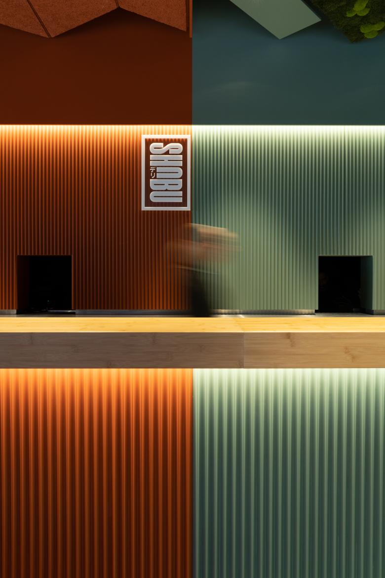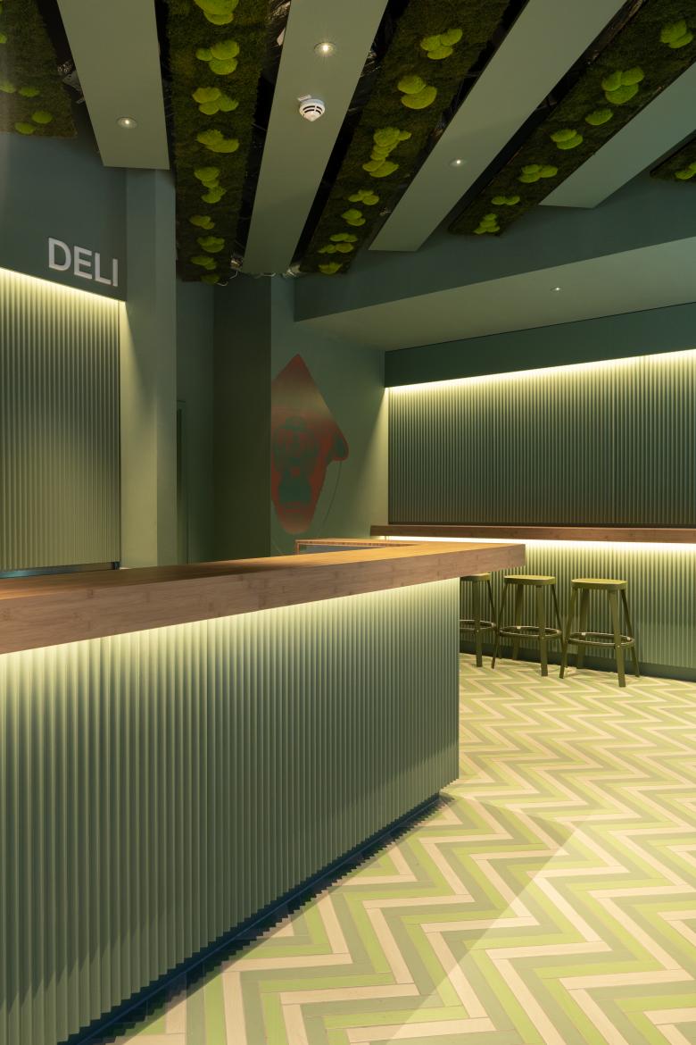 Konzept, Entwurf, Detailplanung und Realisierung, Möblierungs-, Farb-, Material- und Lichtkonzept. Gilt es, zwei unterschiedliche Gastronomiekonzepte in einem Raum eigenständig und doch harmonisch abzubilden, braucht es Fingerspitzengefühl. Hierfür entwickelte Cyrus Ghanai eine beide Konzepte verbindende, einheitliche Materialität. In die Wand- und Thekenvertäfelung aus MDF wurde eine plisseeartige Struktur gefräst. Hinterleuchtet wird die Konstruktion mittels LED-Bänder. Den Boden ließ Ghanai mit Fliesen belegen, die das gestalterische Thema charmant fortführen. Für Orientierung im Raum sorgt die konsequent zweigeteilte Farbgebung. Das Poké erstrahlt in warmem Safranrot; das Deli in gedecktem Avocadogrün. Die Thekenbretter aus Bambusholz fungieren als optische Klammer beider Farbwelten.