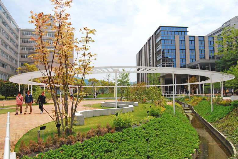 九州産業大学における開学50 周年記念事業の一環として行われた、キャンパスの再整備事業である。九州産業大学のキャンパスにはランダムに配置された校舎、高低差のある地形、キャンパスを分断する水路といった様相があり、それらを積極的に活かしたランドスケープを提案したいと考えた。水路をまたぎ空間に一体感を与える大きな円形のパーゴラ、高低差を利用した棚田状の芝生広場、色彩豊かな植栽によって治水施設から水景施設へと転換された水路等、既存環境を活かし多様なアクティビティやコミュニティを創出する場所をつくり融合させた。学生たちの居場所が屋内にとどまらず屋外にも広がっていくことで、ランドスケープが屋外の学生ラウンジと呼べるような居心地の良い空間となることを期待している。