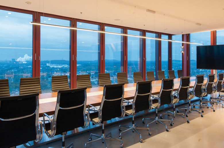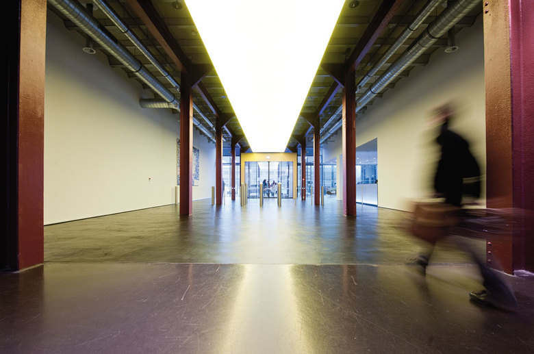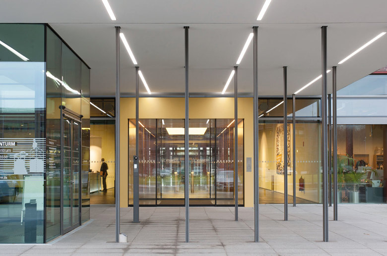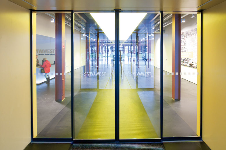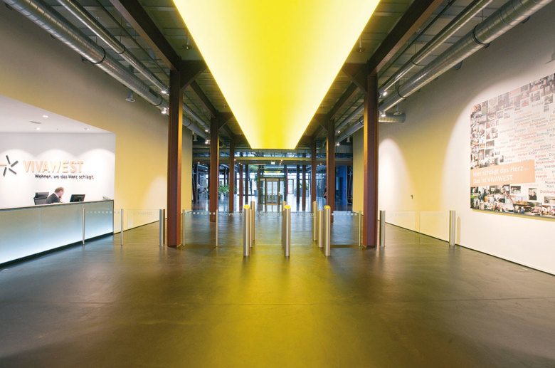 Nach der Aufstockung und dem Ausbau des historischen Nordsternturmes Schacht 2, nutzt Vivawest den Neubaubereich als Büro und Konferenzflächen. Die wegführende Lichtdecke im neu gestalteten Eingangsbereich, begleitet die Mitarbeiter und Besucher in das zentrale Foyer. Mit einer Länge von fast 20 Metern und einer in den Längsseiten monochrom geführten Farbeinspielung im gelbgoldenen Bereich, kann die Lichtdecke Intensität und Lichtfarbe verändern. Die lineare Lichtführung wird im Windfang und Vordach konsequent weitergeführt.