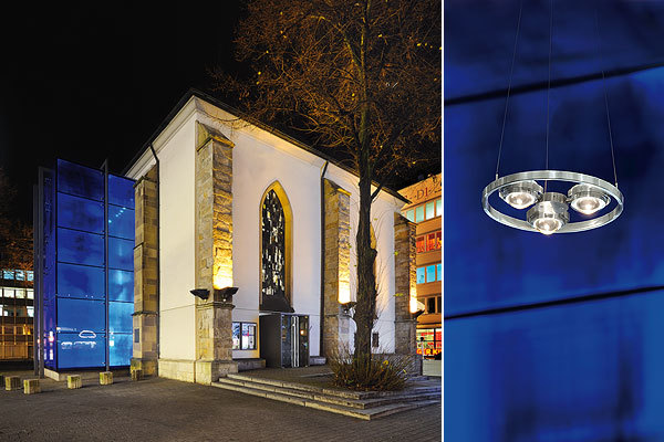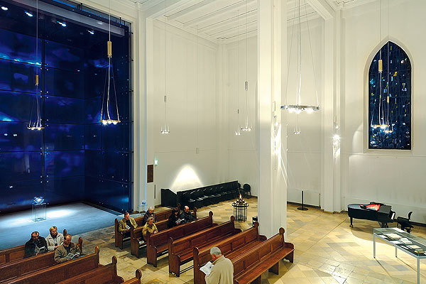 Nach der Zerstörung der Kirche im 2. Weltkrieg wird diese nur teilweise wieder aufgebaut und 1952 als neuer Kirchenraum geweiht. 2005 wird die Kirche um einen blauen Glasanbau erweitert. 2009 erhält die Kirche eine moderne Beleuchtung, die sich dem klaren Anbau anpasst. Die neu entwickelte Leuchte wird sowohl den modernen Anforderungen an die Lichttechnik als auch den Ansprüchen der Kirchenbeleuchtung gerecht.