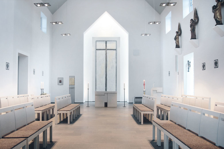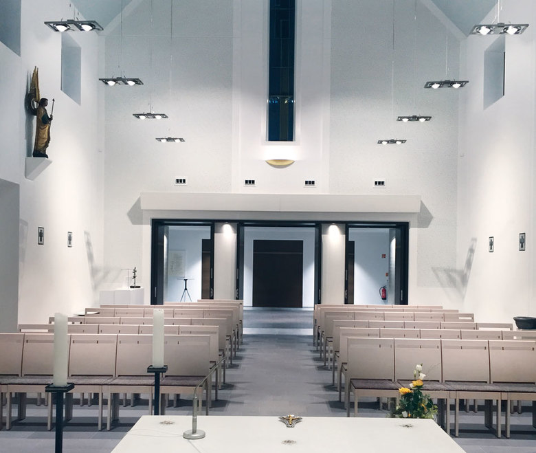 Der zweigeteilte Gebäudekomplex der Begegnungs- stätte wird durch einen zentralen Lichtgang erschlossen. Die durch die Architektur vorgegebene Tageslichtführung wird durch formal reduzierte Beleuchtungskörper in hocheffizienter, dimmbarer LED-Technik nachvollzogen. Eine busgesteuerte Haustechnikanlage optimiert die Schaltungen und Regelung der Beleuchtungsanlage tageslichtabhängig. Die geforderte Einhaltung des Passivhausstandards wird somit gewährleistet.