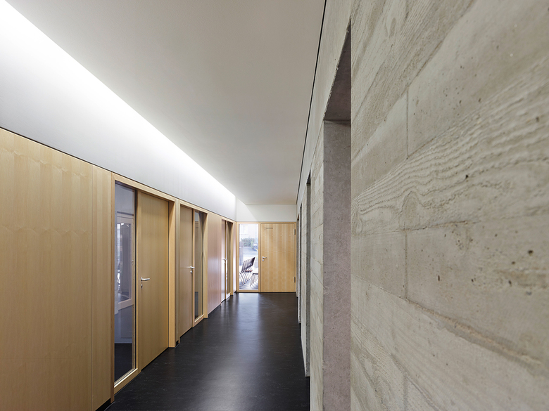 In einer Kleinstadt war im Kontext zweigeschossiger Straßenrandbebauung ein neues Rathaus zu planen. Wir verteilten das Bauvolumen auf zwei Häuser, die sich in Grundfläche und Firsthöhe, Baukörperstellung und Dachform an der umgebenden Bebauung orientieren, sich in der genauen Ausformung und Detaillierung jedoch unverkennbar modern zeigen. Die Baukörper sind zueinander leicht verdreht und in der Tiefe gestaffelt platziert, so dass sich an der Straße ein Vorplatz bildet, während sich die Gebäude im Rückbereich mit der Gartenlandschaft verzahnen. Publikumsnahe Einrichtungen wie Bürgerbüro, Trauzimmer und Gastronomie liegen am Eingang. Eine verglaste Halle zwischen den Baukörpern und ein Treppenhaus erschließen zwei Obergeschosse und ein Hanggeschoss. Kompakte Bauform, konsequente Wärmedämmung und Pellet-Heizung führen zu einem sehr günstigen Energieverbrauch (60% unter EnEV).