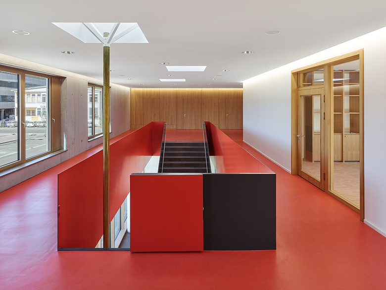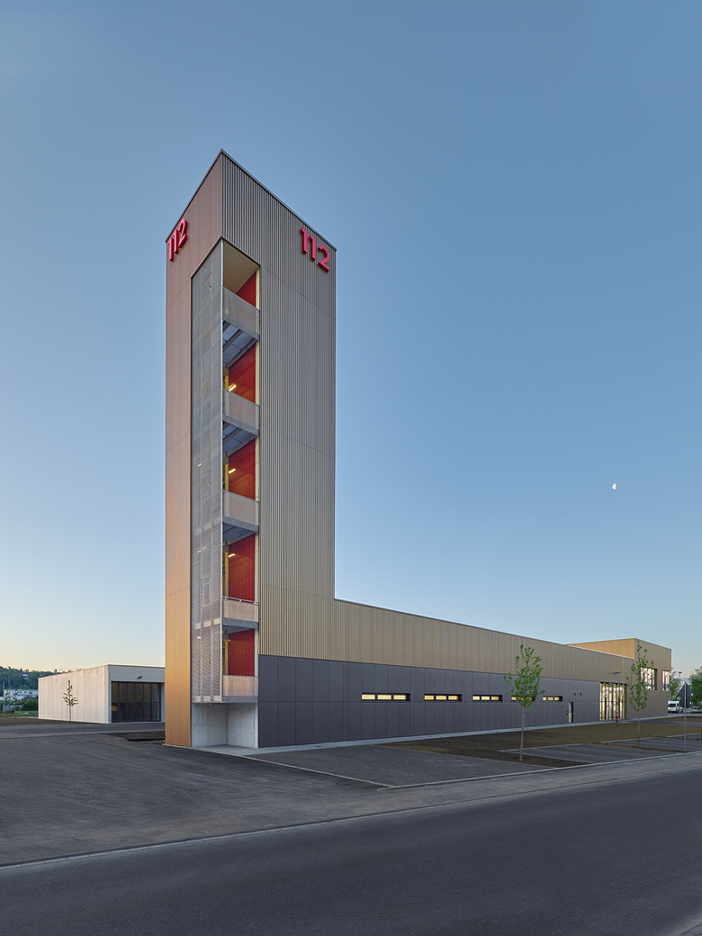 In einem heterogenen Industriegebiet definiert der dreischenklige Baukörper klare Raumkanten und zoniert die Freiräume entsprechend ihrer Funktion: Die Einsatzkräfte erreichen ihre der Stadt zugewandten Parkplätze im Süden, werden auf kürzestem Weg durch die Umkleiden im Querriegel zu ihren Einsatzfahrzeugen geführt und verlassen das Gelände über zwei Ausfahrten im Norden. Im westlichen Schenkel sind übergeordnete Funktionen wie Schlauchwäsche, Atemschutzstrecke, Werkstätten und Waschhallen untergebracht. Der Schlauch-