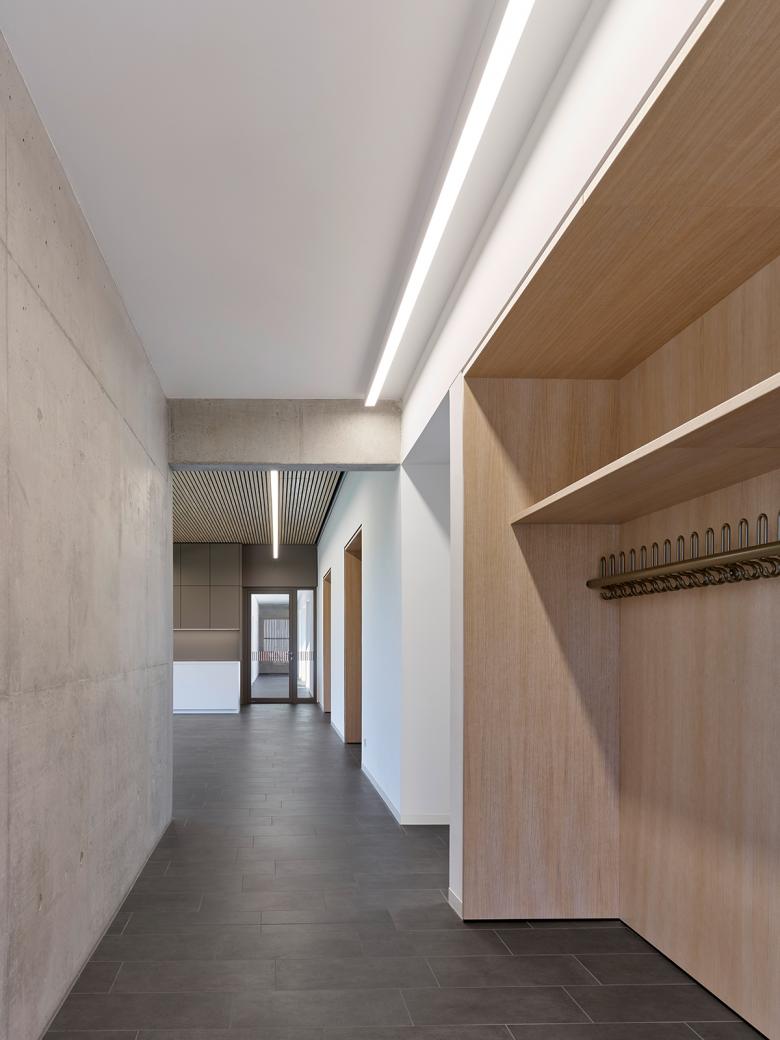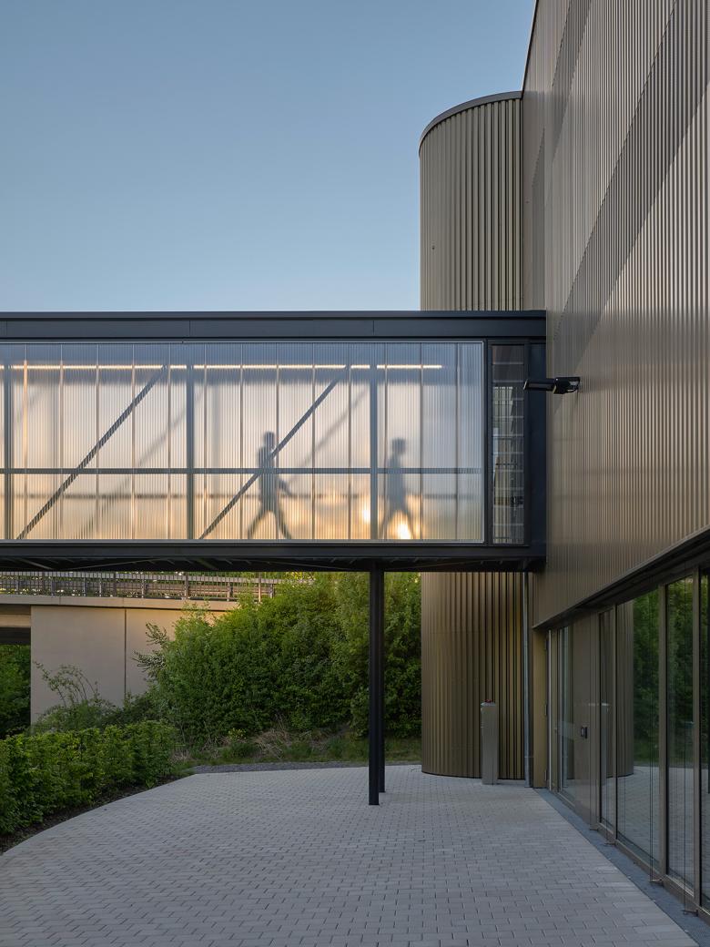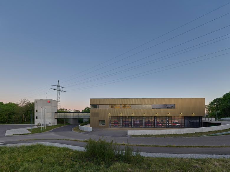 In der beengten Fläche einer kreisförmigen Auffahrtsrampe zur übergeordneten Kreisstraße war ein Feuerwehrhaus für 6 Einsatzfahrzeuge und eine Rettungswache des Deutschen Roten Kreuzes mit 2 Fahrzeugen zu planen. Aus Platzmangel mussten der Parkplatz für die anrückenden Einsatzkräfte und der Übungsturm jenseits der Straße untergebracht werden. Der Turm wird zugleich als Treppenaufgang für die Brücke genutzt, die direkt ins Feuerwehrhaus zu den Umkleiden im 1. Obergeschoss führt. Eine Rutschstange und zwei Treppen stellen die Verbindung zu den Fahrzeugen und der Einsatzzentrale im Erdgeschoss her. Weiter sind im EG eine Waschhalle sowie Lager- und Technikräume untergebracht. Im 2. Obergeschoss befinden sich Leitungs- und Schulungsräume für bis zu 350 Personen und die Räume der Jugendfeuerwehr, gruppiert um eine große Dachterrasse.