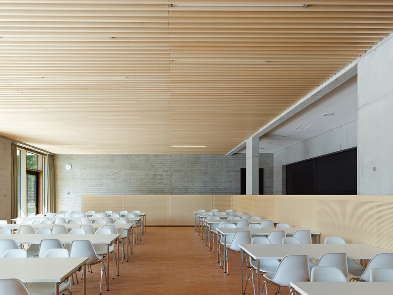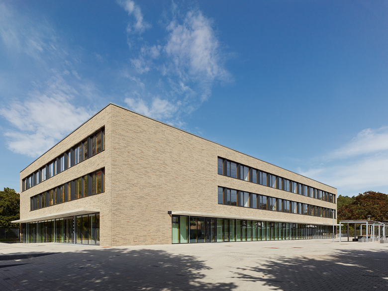 Das bestehende Schulzentrum mit Grundschule, Realschule und Sporthallen war um ein 2-zügiges Gymnasium zu ergänzen. Auf rechteckigem Grundriss entwickelten wir einen kompakten 3-geschossigen Baukörper. Im Erdgeschoss liegen Verwaltungsräume, Schüleraufenthaltsräume für die Ganztagesbetreuung und eine Mensa mit 145 Plätzen. Das lichtdurchflutete Atrium ist mit dem Musikraum zu einer Aula koppelbar. Offene Treppen führen in die beiden Obergeschosse. Dort liegen an den Außenfassaden alle 28 Klassen- und Fachräume sowie eine Bibliothek. Nebenräume werden über die beiden Atrien belichtet. Klare Bauform, kontrollierte Lüftung mit Wärmerückgewinnung, Fotovoltaikanlage, Fernheizung und eine gute Wärmedämmung ergeben energetisch ein 2-Liter-Haus oder auch: ein „Passivhaus nach gesundem Menschenverstand“, nämlich ohne exorbitante Mehrkosten für das letzte Quäntchen Energieeinsparung.